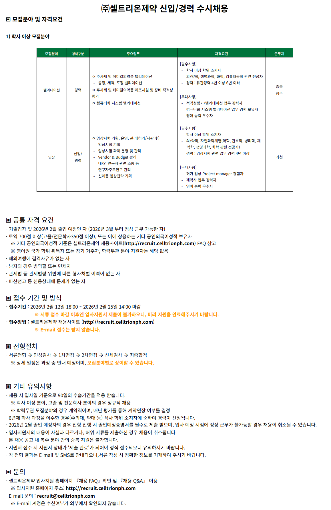- Á¢¼ö¹æ¹ý : ¼¿Æ®¸®¿ÂÁ¦¾à ä¿ë»çÀÌÆ® (http://recruit.celltrionph.com)