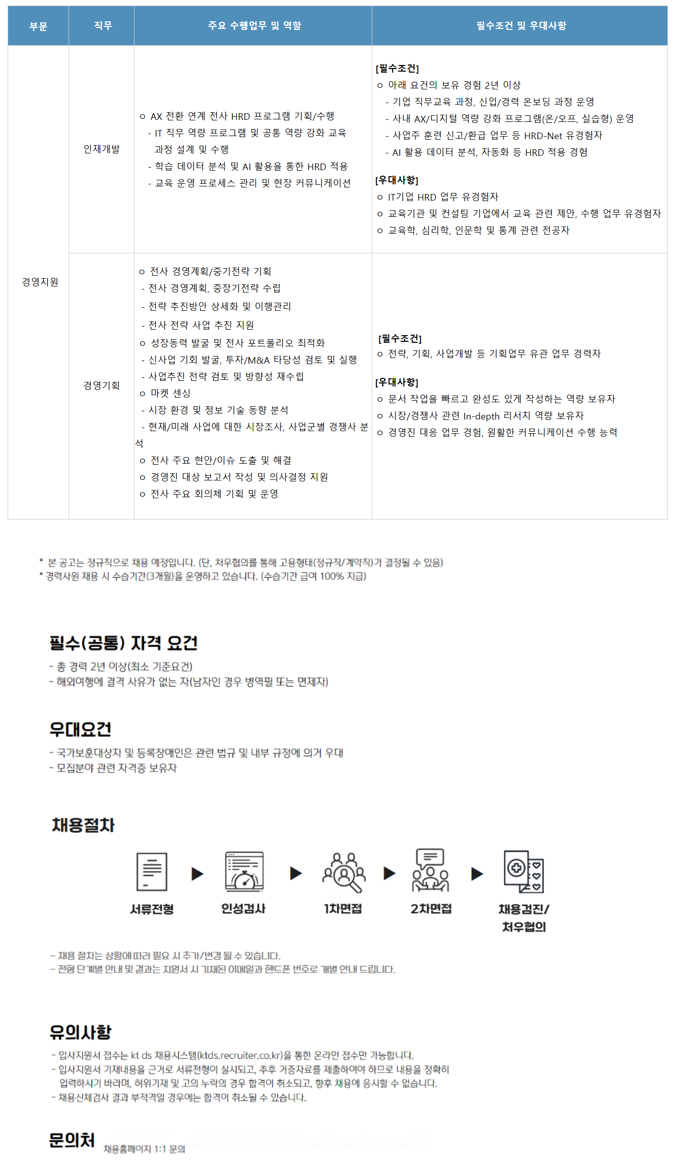 ºÎ¹® Á÷¹« ÁÖ¿ä ¼öÇà¾÷¹« ¹× ¿ªÇÒ ÇʼöÁ¶°Ç ¹× ¿ì´ë»çÇ× °æ¿µÁö¿ø ÀÎÀç°³¹ß ¤· AX Àüȯ ¿¬°è Àü»ç HRD ÇÁ·Î±×·¥ ±âȹ/¼öÇà - IT Á÷¹« ¿ª·® ÇÁ·Î±×·¥ ¹× °øÅë ¿ª·® °­È­ ±³À° °úÁ¤ ¼³°è ¹× ¼öÇà - ÇнÀ µ¥ÀÌÅÍ ºÐ¼® ¹× AI Ȱ¿ëÀ» ÅëÇÑ HRD Àû¿ë - ±³À° ¿î¿µ ÇÁ·Î¼¼½º °ü¸® ¹× ÇöÀå Ä¿¹Â´ÏÄÉÀÌ¼Ç [ÇʼöÁ¶°Ç] ¤· ¾Æ·¡ ¿ä°ÇÀÇ º¸À¯ °æÇè 2³â ÀÌ»ó - ±â¾÷ Á÷¹«±³À° °úÁ¤, ½ÅÀÔ/°æ·Â ¿Âº¸µù °úÁ¤ ¿î¿µ - »ç³» AX/µðÁöÅÐ ¿ª·® °­È­ ÇÁ·Î±×·¥(¿Â/¿ÀÇÁ, ½Ç½ÀÇü) ¿î¿µ - »ç¾÷ÁÖ ÈÆ·Ã ½Å°í/ȯ±Þ ¾÷¹« µî HRD-Net À¯°æÇèÀÚ - AI Ȱ¿ë µ¥ÀÌÅÍ ºÐ¼®, ÀÚµ¿È­ µî HRD Àû¿ë °æÇè [¿ì´ë»çÇ×] ¤· IT±â¾÷ HRD ¾÷¹« À¯°æÇèÀÚ ¤· ±³À°±â°ü ¹× ÄÁ¼³ÆÃ ±â¾÷¿¡¼­ ±³À° °ü·Ã Á¦¾È, ¼öÇà ¾÷¹« À¯°æÇèÀÚ ¤· ±³À°ÇÐ, ½É¸®ÇÐ, Àι®ÇÐ ¹× Åë°è °ü·Ã Àü°øÀÚ °æ¿µ±âȹ ¤· Àü»ç °æ¿µ°èȹ/Áß±âÀü·« ±âȹ - Àü»ç °æ¿µ°èȹ, ÁßÀå±âÀü·« ¼ö¸³ - Àü·« ÃßÁø¹æ¾È »ó¼¼È­ ¹× ÀÌÇà°ü¸® - Àü»ç Àü·« »ç¾÷ ÃßÁø Áö¿ø ¤· ¼ºÀ嵿·Â ¹ß±¼ ¹× Àü»ç Æ÷Æ®Æú¸®¿À ÃÖÀûÈ­ - ½Å»ç¾÷ ±âȸ ¹ß±¼, ÅõÀÚ/M&A Ÿ´ç¼º °ËÅä ¹× ½ÇÇà - »ç¾÷ÃßÁø Àü·« °ËÅä ¹× ¹æÇ⼺ Àç¼ö¸³ ¤· ¸¶ÄÏ ¼¾½Ì - ½ÃÀå ȯ°æ ¹× Á¤º¸ ±â¼ú µ¿Ç⠺м® - ÇöÀç/¹Ì·¡ »ç¾÷¿¡ ´ëÇÑ ½ÃÀåÁ¶»ç, »ç¾÷±ºº° °æÀï»ç ºÐ¼® ¤· Àü»ç ÁÖ¿ä Çö¾È/À̽´ µµÃâ ¹× ÇØ°á ¤· °æ¿µÁø ´ë»ó º¸°í¼­ ÀÛ¼º ¹× ÀÇ»ç°áÁ¤ Áö¿ø ¤· Àü»ç ÁÖ¿ä ȸÀÇü ±âȹ ¹× ¿î¿µ [ÇʼöÁ¶°Ç] ¤· Àü·«, ±âȹ, »ç¾÷°³¹ß µî ±âȹ¾÷¹« À¯°ü ¾÷¹« °æ·ÂÀÚ [¿ì´ë»çÇ×] ¤· ¹®¼­ ÀÛ¾÷À» ºü¸£°í ¿Ï¼ºµµ ÀÖ°Ô ÀÛ¼ºÇÏ´Â ¿ª·® º¸À¯ÀÚ ¤· ½ÃÀå/°æÀï»ç °ü·Ã In-depth ¸®¼­Ä¡ ¿ª·® º¸À¯ÀÚ ¤· °æ¿µÁø ´ëÀÀ ¾÷¹« °æÇè, ¿øÈ°ÇÑ Ä¿¹Â´ÏÄÉÀÌ¼Ç ¼öÇà ´É·Â
