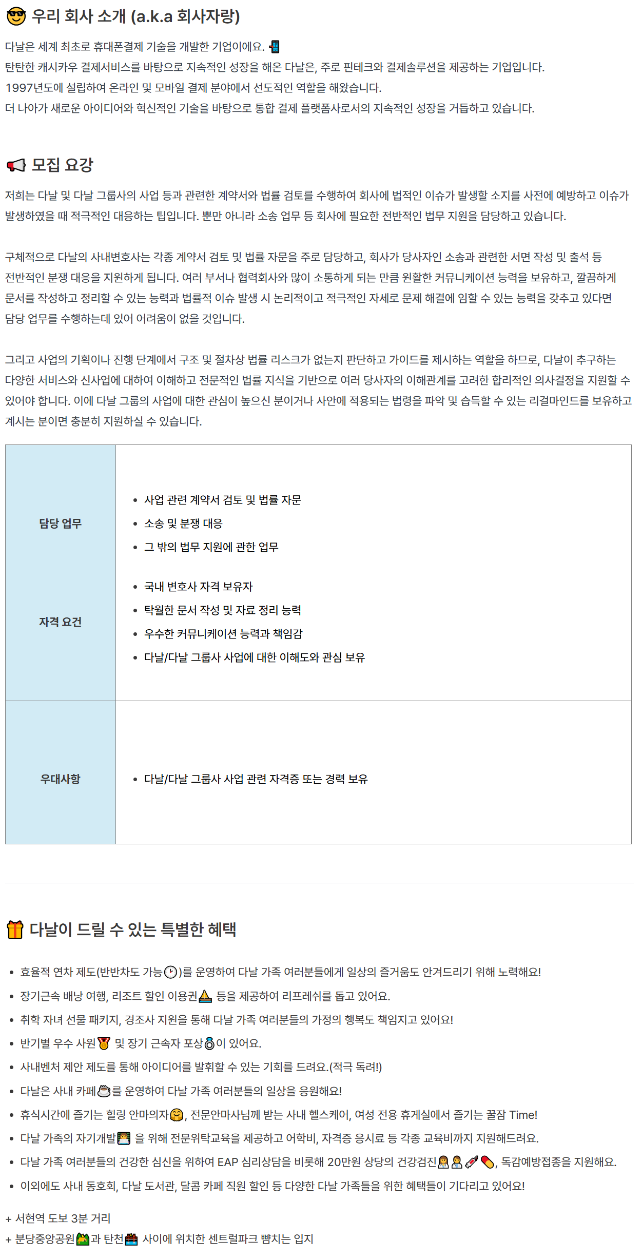 ±¸Ã¼ÀûÀ¸·Î ´Ù³¯ÀÇ »ç³»º¯È£»ç´Â °¢Á¾ °è¾à¼ °ËÅä ¹× ¹ý·ü ÀÚ¹®À» ÁÖ·Î ´ã´çÇϰí, ȸ»ç°¡ ´ç»çÀÚÀÎ ¼Ò¼Û°ú °ü·ÃÇÑ ¼¸é ÀÛ¼º ¹× Ãâ¼® µî Àü¹ÝÀûÀÎ ºÐÀï ´ëÀÀÀ» Áö¿øÇÏ°Ô µË´Ï´Ù. ¿©·¯ ºÎ¼³ª Çù·Âȸ»ç¿Í ¸¹ÀÌ ¼ÒÅëÇÏ°Ô µÇ´Â ¸¸Å ¿øÈ°ÇÑ Ä¿¹Â´ÏÄÉÀÌ¼Ç ´É·ÂÀ» º¸À¯Çϰí, ±ò²ûÇÏ°Ô ¹®¼¸¦ ÀÛ¼ºÇϰí Á¤¸®ÇÒ ¼ö ÀÖ´Â ´É·Â°ú ¹ý·üÀû À̽´ ¹ß»ý ½Ã ³í¸®ÀûÀ̰í Àû±ØÀûÀÎ ÀÚ¼¼·Î ¹®Á¦ ÇØ°á¿¡ ÀÓÇÒ ¼ö ÀÖ´Â ´É·ÂÀ» °®Ãß°í ÀÖ´Ù¸é ´ã´ç ¾÷¹«¸¦ ¼öÇàÇϴµ¥ ÀÖ¾î ¾î·Á¿òÀÌ ¾øÀ» °ÍÀÔ´Ï´Ù.