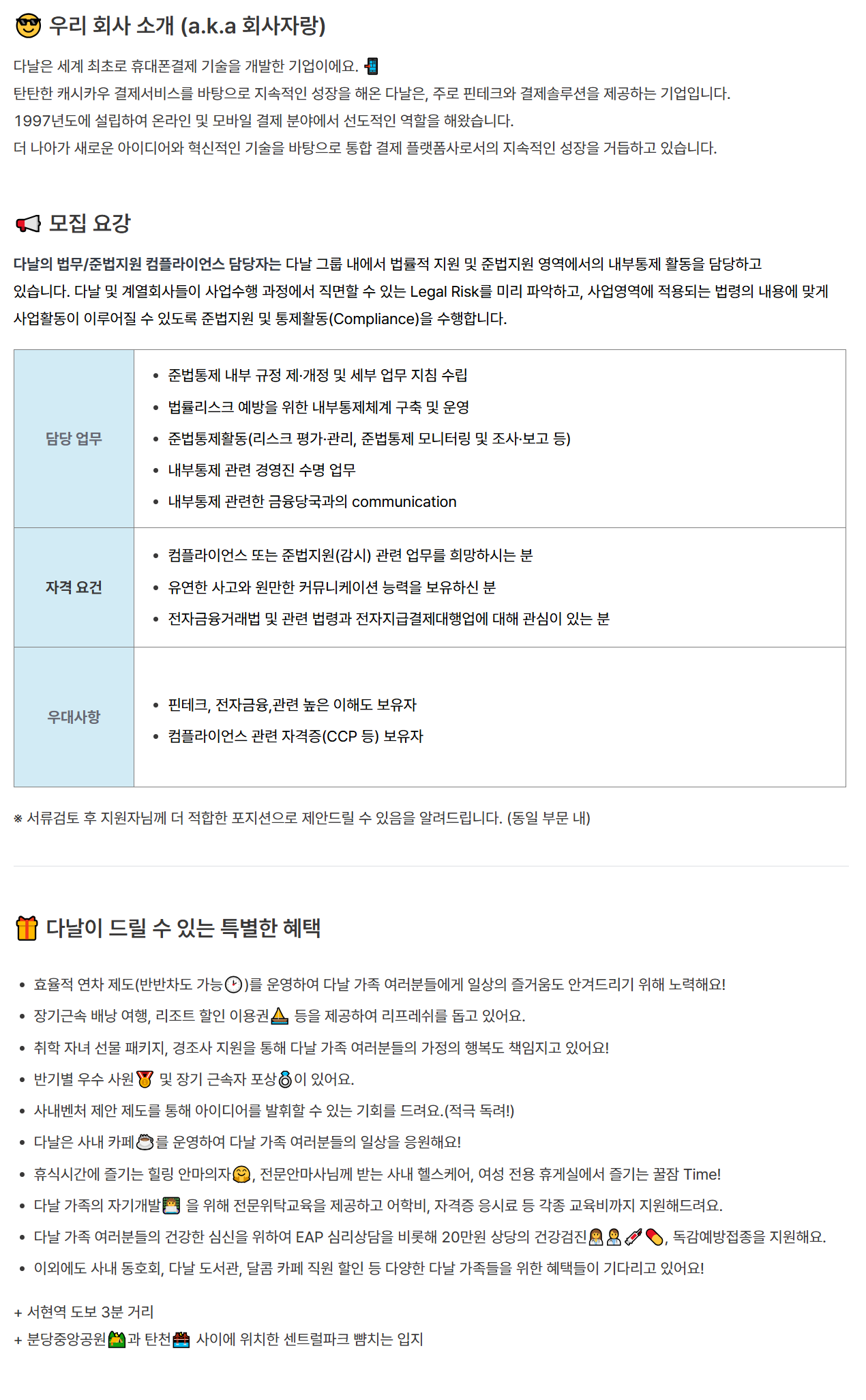 ´Ù³¯ÀÇ ¹ý¹«/ÁعýÁö¿ø ÄÄÇöóÀ̾𽺠´ã´çÀÚ´Â ´Ù³¯ ±×·ì ³»¿¡¼ ¹ý·üÀû Áö¿ø ¹× ÁعýÁö¿ø ¿µ¿ª¿¡¼ÀÇ ³»ºÎÅëÁ¦ Ȱµ¿À» ´ã´çÇϰí ÀÖ½À´Ï´Ù. ´Ù³¯ ¹× °è¿È¸»çµéÀÌ »ç¾÷¼öÇà °úÁ¤¿¡¼ Á÷¸éÇÒ ¼ö ÀÖ´Â Legal Risk¸¦ ¹Ì¸® ÆÄ¾ÇÇϰí, »ç¾÷¿µ¿ª¿¡ Àû¿ëµÇ´Â ¹ý·ÉÀÇ ³»¿ë¿¡ ¸Â°Ô »ç¾÷Ȱµ¿ÀÌ ÀÌ·ç¾îÁú ¼ö ÀÖµµ·Ï ÁعýÁö¿ø ¹× ÅëÁ¦È°µ¿(Compliance)À» ¼öÇàÇÕ´Ï´Ù.