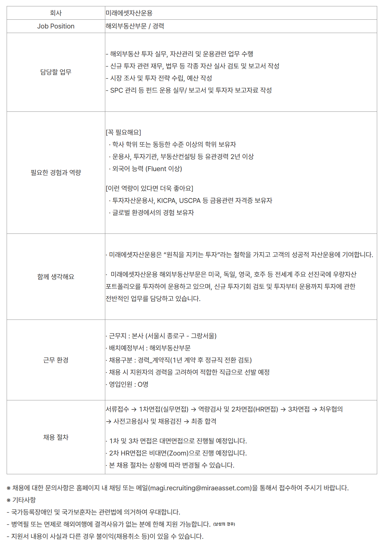 ȸ»ç ¹Ì·¡¿¡¼ÂÀÚ»ê¿î¿ë Job Position ÇØ¿ÜºÎµ¿»êºÎ¹® / °æ·Â ´ã´çÇÒ ¾÷¹« - ÇØ¿ÜºÎµ¿»ê ÅõÀÚ ½Ç¹«, ÀÚ»ê°ü¸® ¹× ¿î¿ë°ü·Ã ¾÷¹« ¼öÇà - ½Å±Ô ÅõÀÚ °ü·Ã À繫, ¹ý¹« µî °¢Á¾ ÀÚ»ê ½Ç»ç °ËÅä ¹× º¸°í¼­ ÀÛ¼º - ½ÃÀå Á¶»ç ¹× ÅõÀÚ Àü·« ¼ö¸³, ¿¹»ê ÀÛ¼º - SPC °ü¸® µî ÆÝµå ¿î¿ë ½Ç¹«/ º¸°í¼­ ¹× ÅõÀÚÀÚ º¸°íÀÚ·á ÀÛ¼º ÇÊ¿äÇÑ °æÇè°ú ¿ª·® [²À ÇÊ¿äÇØ¿ä] ¡¤ Çлç ÇÐÀ§ ¶Ç´Â µ¿µîÇÑ ¼öÁØ ÀÌ»óÀÇ ÇÐÀ§ º¸À¯ÀÚ ¡¤ ¿î¿ë»ç, ÅõÀÚ±â°ü, ºÎµ¿»êÄÁ¼³ÆÃ µî À¯°ü°æ·Â 2³â ÀÌ»ó ¡¤ ¿Ü±¹¾î ´É·Â (Fluent ÀÌ»ó) [ÀÌ·± ¿ª·®ÀÌ ÀÖ´Ù¸é ´õ¿í ÁÁ¾Æ¿ä] ¡¤ ÅõÀÚÀÚ»ê¿î¿ë»ç, KICPA, USCPA µî ±ÝÀ¶°ü·Ã ÀÚ°ÝÁõ º¸À¯ÀÚ ¡¤ ±Û·Î¹ú ȯ°æ¿¡¼­ÀÇ °æÇè º¸À¯ÀÚ ÇÔ²² »ý°¢ÇØ¿ä ¡¤ ¹Ì·¡¿¡¼ÂÀÚ»ê¿î¿ëÀº ¡°¿øÄ¢À» ÁöŰ´Â ÅõÀÚ¡±¶ó´Â öÇÐÀ» °¡Áö°í °í°´ÀÇ ¼º°øÀû ÀÚ»ê¿î¿ë¿¡ ±â¿©ÇÕ´Ï´Ù. ¡¤ ¹Ì·¡¿¡¼ÂÀÚ»ê¿î¿ë ÇØ¿ÜºÎµ¿»êºÎ¹®Àº ¹Ì±¹, µ¶ÀÏ, ¿µ±¹, È£ÁÖ µî Àü¼¼°è ÁÖ¿ä ¼±Áø±¹¿¡ ¿ì·®ÀÚ»ê Æ÷Æ®Æú¸®¿À¸¦ ÅõÀÚÇÏ¿© ¿î¿ëÇϰí ÀÖÀ¸¸ç, ½Å±Ô ÅõÀÚ±âȸ °ËÅä ¹× ÅõÀÚºÎÅÍ ¿î¿ë±îÁö ÅõÀÚ¿¡ °üÇÑ Àü¹ÝÀûÀÎ ¾÷¹«¸¦ ´ã´çÇϰí ÀÖ½À´Ï´Ù. ±Ù¹« ȯ°æ ¡¤ ±Ù¹«Áö : º»»ç (¼­¿ï½Ã Á¾·Î±¸ - ±×¶û¼­¿ï) ¡¤ ¹èÄ¡¿¹Á¤ºÎ¼­ : ÇØ¿ÜºÎµ¿»êºÎ¹® ¡¤ ä¿ë±¸ºÐ : °æ·Â_°è¾àÁ÷(1³â °è¾à ÈÄ Á¤±ÔÁ÷ Àüȯ °ËÅä) ¡¤ ä¿ë ½Ã Áö¿øÀÚÀÇ °æ·ÂÀ» °í·ÁÇÏ¿© ÀûÇÕÇÑ Á÷±ÞÀ¸·Î ¼±¹ß ¿¹Á¤ ¡¤ ¿µÀÔÀοø : O¸í ä¿ë ÀýÂ÷ ¼­·ùÁ¢¼ö ¡æ 1Â÷¸éÁ¢(½Ç¹«¸éÁ¢) ¡æ ¿ª·®°Ë»ç ¹× 2Â÷¸éÁ¢(HR¸éÁ¢) ¡æ 3Â÷¸éÁ¢ ¡æ ó¿ìÇùÀÇ ¡æ »çÀü°í¿ë½É»ç ¹× ä¿ë°ËÁø ¡æ ÃÖÁ¾ ÇÕ°Ý ¡¤ 1Â÷ ¹× 3Â÷ ¸éÁ¢Àº ´ë¸é¸éÁ¢À¸·Î ÁøÇàµÉ ¿¹Á¤ÀÔ´Ï´Ù. ¡¤ 2Â÷ HR¸éÁ¢Àº ºñ´ë¸é(Zoom)À¸·Î ÁøÇà ¿¹Á¤ÀÔ´Ï´Ù. ¡¤ º» ä¿ë ÀýÂ÷´Â »óȲ¿¡ µû¶ó º¯°æµÉ ¼ö ÀÖ½À´Ï´Ù. ¡Ø ä¿ë¿¡ ´ëÇÑ ¹®ÀÇ»çÇ×Àº ȨÆäÀÌÁö ³» äÆÃ ¶Ç´Â ¸ÞÀÏ(******@*******.***)À» ÅëÇØ¼­ Á¢¼öÇÏ¿© Áֽñ⠹ٶø´Ï´Ù.