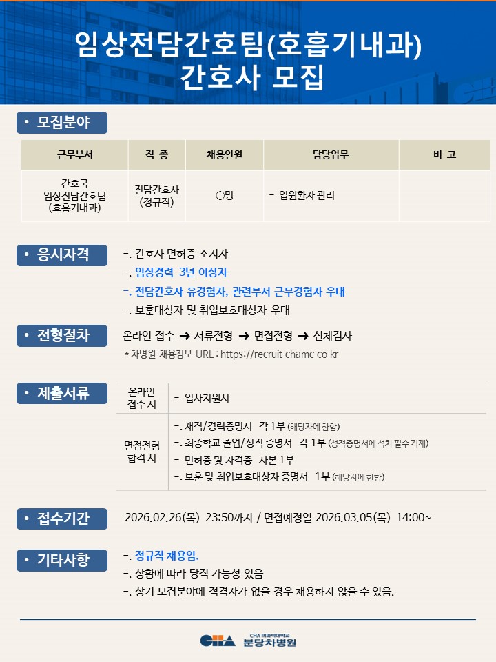[ºÐ´çÂ÷º´¿ø] ÀÓ»óÀü´ã°£È£ÆÀ(È£Èí±â³»°ú) °£È£»ç ¸ðÁý