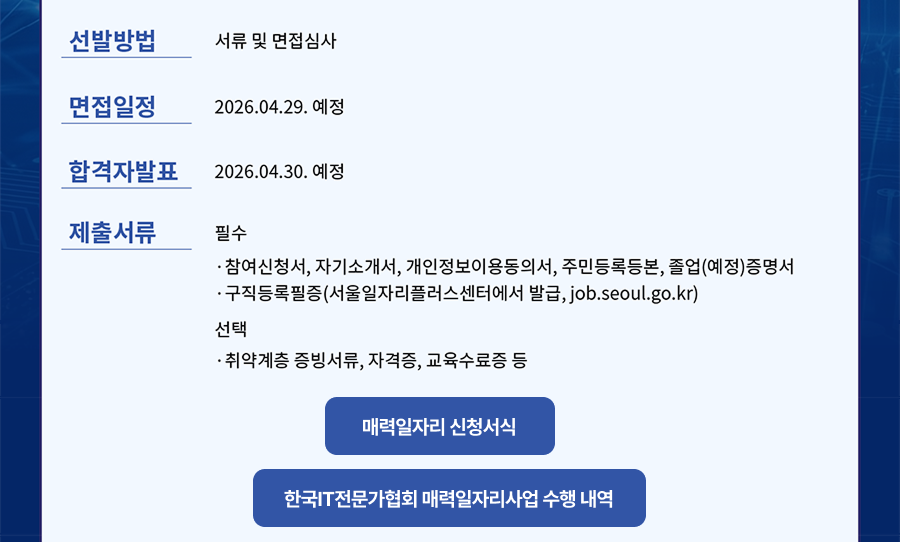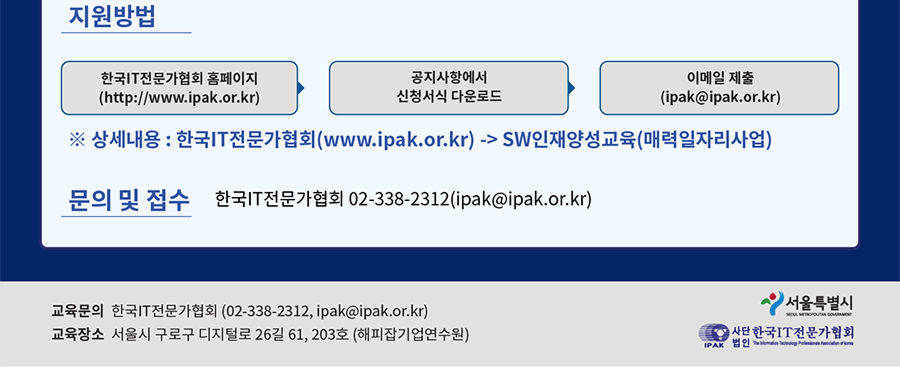 ¡Ø »ó¼¼³»¿ë : Çѱ¹ITÀü¹®°¡Çùȸ(www.ipak.or.kr) -> SWÀÎÀç¾ç¼º±³À°(¸Å·ÂÀÏÀÚ¸®»ç¾÷)