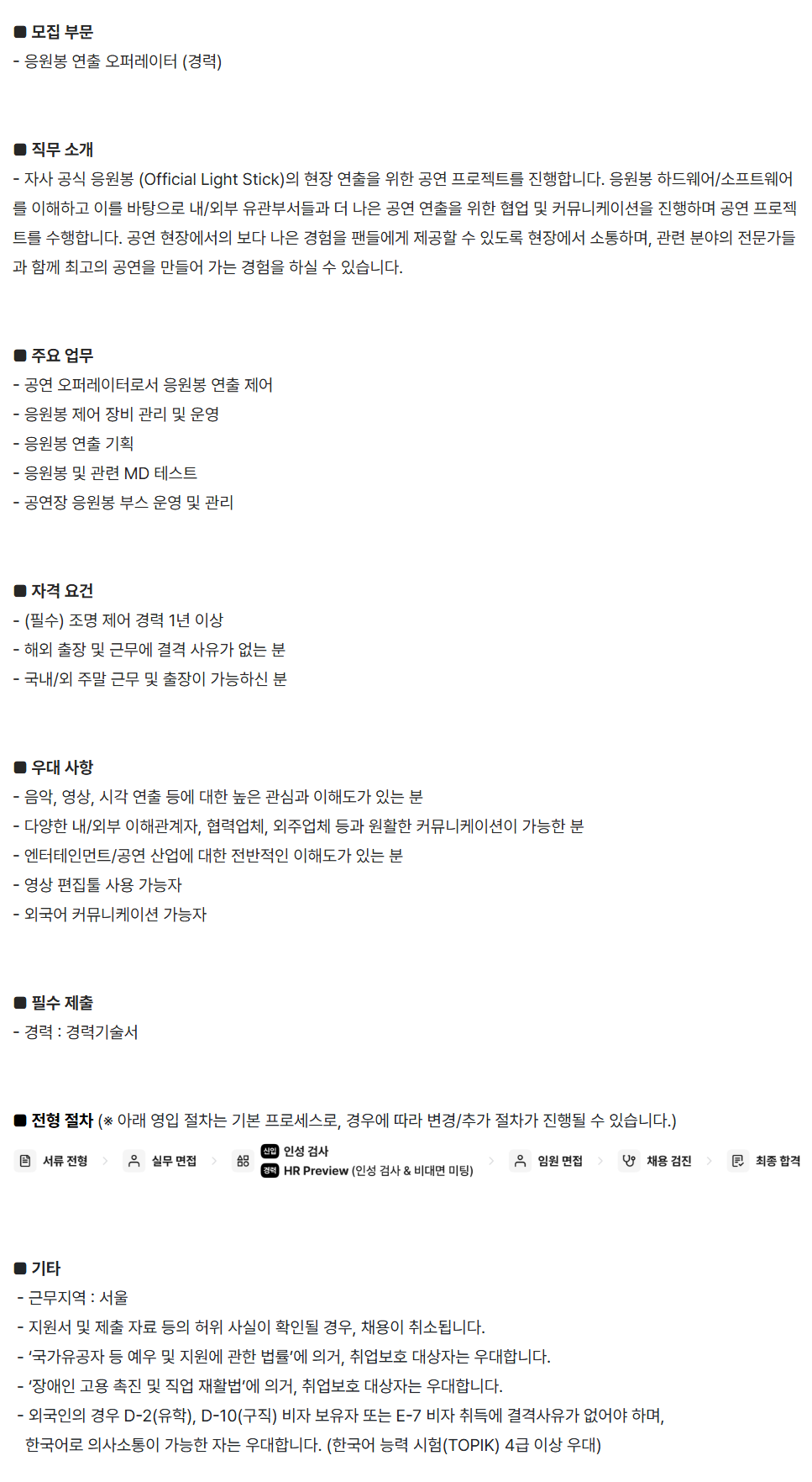 [JYP ENTERTAINMENT] ÀÀ¿øºÀ ¿¬Ãâ ¿ÀÆÛ·¹ÀÌÅÍ (°æ·Â) ¡á ¸ðÁý ​ºÎ¹® - ÀÀ¿øºÀ ​¿¬Ãâ ​¿ÀÆÛ·¹ÀÌÅÍ (°æ·Â) ¡á ​Á÷¹« ¼Ò°³ - ÀÚ»ç °ø½Ä ​ÀÀ¿øºÀ ​(Official Light ​Stick)ÀÇ ÇöÀå ¿¬ÃâÀ» ​À§ÇÑ °ø¿¬ ​ÇÁ·ÎÁ§Æ®¸¦ ​ÁøÇàÇÕ´Ï´Ù. ÀÀ¿øºÀ ​Çϵå¿þ¾î/¼ÒÇÁÆ®¿þ¾î¸¦ ​ÀÌÇØÇϰí ​À̸¦ ¹ÙÅÁÀ¸·Î ³»/¿ÜºÎ ​À¯°üºÎ¼­µé°ú ​´õ ³ªÀº °ø¿¬ ​¿¬ÃâÀ» ​À§ÇÑ ​Çù¾÷ ¹× Ä¿¹Â´ÏÄÉÀ̼ÇÀ» ​ÁøÇàÇÏ¸ç °ø¿¬ ​ÇÁ·ÎÁ§Æ®¸¦ ​¼öÇàÇÕ´Ï´Ù. °ø¿¬ ​ÇöÀå¿¡¼­ÀÇ º¸´Ù ​³ªÀº ​°æÇèÀ» ÆÒµé¿¡°Ô Á¦°øÇÒ ​¼ö ÀÖµµ·Ï ​ÇöÀå¿¡¼­ ¼ÒÅëÇϸç, °ü·Ã ºÐ¾ßÀÇ Àü¹®°¡µé°ú ÇÔ²² ÃÖ°íÀÇ °ø¿¬À» ¸¸µé¾î °¡´Â °æÇèÀ» ÇÏ½Ç ¼ö ÀÖ½À´Ï´Ù. ¡á ÁÖ¿ä ¾÷¹« - °ø¿¬ ¿ÀÆÛ·¹ÀÌÅͷμ­ ÀÀ¿øºÀ ¿¬Ãâ Á¦¾î - ÀÀ¿øºÀ Á¦¾î Àåºñ °ü¸® ¹× ¿î¿µ - ÀÀ¿øºÀ ¿¬Ãâ ±âȹ - ÀÀ¿øºÀ ¹× °ü·Ã MD Å×½ºÆ® - °ø¿¬Àå ÀÀ¿øºÀ ºÎ½º ¿î¿µ ¹× °ü¸® ¡á ÀÚ°Ý ¿ä°Ç - (Çʼö) Á¶¸í Á¦¾î °æ·Â 1³â ÀÌ»ó - ÇØ¿Ü ÃâÀå ¹× ±Ù¹«¿¡ °á°Ý »çÀ¯°¡ ¾ø´Â ºÐ - ±¹³»/¿Ü ÁÖ¸» ±Ù¹« ¹× ÃâÀåÀÌ °¡´ÉÇϽŠºÐ ¡á ¿ì´ë »çÇ× - À½¾Ç, ¿µ»ó, ½Ã°¢ ¿¬Ã⠵ ´ëÇÑ ³ôÀº °ü½É°ú ÀÌÇØµµ°¡ ÀÖ´Â ºÐ - ´Ù¾çÇÑ ³»/¿ÜºÎ ÀÌÇØ°ü°èÀÚ, Çù·Â¾÷ü, ¿ÜÁÖ¾÷ü µî°ú ¿øÈ°ÇÑ Ä¿¹Â´ÏÄÉÀ̼ÇÀÌ °¡´ÉÇÑ ºÐ - ¿£ÅÍÅ×ÀÎ¸ÕÆ®/°ø¿¬ »ê¾÷¿¡ ´ëÇÑ Àü¹ÝÀûÀÎ ÀÌÇØµµ°¡ ÀÖ´Â ºÐ - ¿µ»ó ÆíÁýÅø »ç¿ë °¡´ÉÀÚ - ¿Ü±¹¾î Ä¿¹Â´ÏÄÉÀÌ¼Ç °¡´ÉÀÚ ¡á Çʼö Á¦Ãâ - °æ·Â : °æ·Â±â¼ú¼­