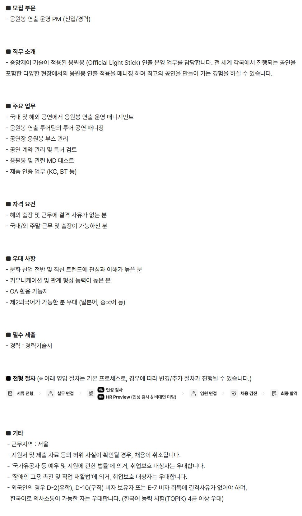 [JYP ENTERTAINMENT] ÀÀ¿øºÀ ¿¬Ã⠿ PM (½ÅÀÔ/°æ·Â) ¡á ¸ðÁý ​ºÎ¹® - ÀÀ¿øºÀ ​¿¬Ãâ ​¿î¿µ PM ​(½ÅÀÔ/°æ·Â) ¡á Á÷¹« ¼Ò°³ - Áß¾ÓÁ¦¾î ​±â¼úÀÌ ​Àû¿ëµÈ ÀÀ¿øºÀ ​(Official Light Stick) ​¿¬Ã⠿ ​¾÷¹«¸¦ ​´ã´çÇÕ´Ï´Ù. Àü ​¼¼°è ​°¢±¹¿¡¼­ ​ÁøÇàµÇ´Â °ø¿¬À» Æ÷ÇÔÇÑ ​´Ù¾çÇÑ ​ÇöÀå¿¡¼­ÀÇ ÀÀ¿øºÀ ¿¬Ãâ ​Àû¿ëÀ» ​¸Å´Ï¡ ​Çϸç ÃÖ°íÀÇ °ø¿¬À» ​¸¸µé¾î °¡´Â ​°æÇèÀ» ​ÇÏ½Ç ¼ö ​ÀÖ½À´Ï´Ù. ¡á ÁÖ¿ä ​¾÷¹« - ±¹³» ​¹× ÇØ¿Ü °ø¿¬¿¡¼­ ​ÀÀ¿øºÀ ¿¬Ãâ ​¿î¿µ ¸Å´ÏÁö¸ÕÆ® - ÀÀ¿øºÀ ¿¬Ãâ Åõ¾îÆÀÀÇ Åõ¾î °ø¿¬ ¸Å´Ï¡ - °ø¿¬Àå ÀÀ¿øºÀ ºÎ½º °ü¸® - °ø¿¬ °è¾à °ü¸® ¹× ƯÇã °ËÅä - ÀÀ¿øºÀ ¹× °ü·Ã MD Å×½ºÆ® - Á¦Ç° ÀÎÁõ ¾÷¹« (KC, BT µî) ¡á ÀÚ°Ý ¿ä°Ç - ÇØ¿Ü ÃâÀå ¹× ±Ù¹«¿¡ °á°Ý »çÀ¯°¡ ¾ø´Â ºÐ - ±¹³»/¿Ü ÁÖ¸» ±Ù¹« ¹× ÃâÀåÀÌ °¡´ÉÇϽŠºÐ ¡á ¿ì´ë »çÇ× - ¹®È­ »ê¾÷ Àü¹Ý ¹× ÃֽŠƮ·»µå¿¡ °ü½É°ú ÀÌÇØ°¡ ³ôÀº ºÐ - Ä¿¹Â´ÏÄÉÀÌ¼Ç ¹× °ü°è Çü¼º ´É·ÂÀÌ ³ôÀº ºÐ - OA Ȱ¿ë °¡´ÉÀÚ - Á¦2¿Ü±¹¾î°¡ °¡´ÉÇÑ ºÐ ¿ì´ë (ÀϺ»¾î, Áß±¹¾î µî) ¡á Çʼö Á¦Ãâ - °æ·Â : °æ·Â±â¼ú¼­