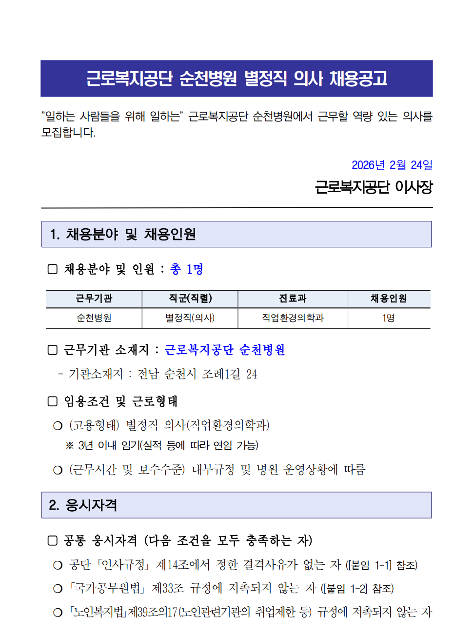 ±Ù·Îº¹Áö°ø´Ü ¼øÃµº´¿ø º°Á¤Á÷ ÀÇ»ç ä¿ë°ø°í