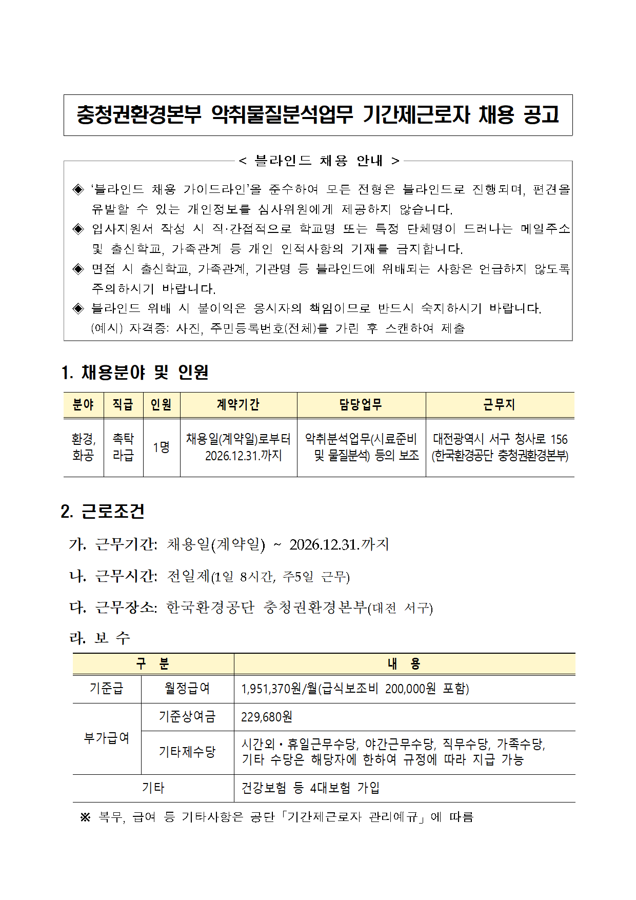 Çѱ¹È¯°æ°ø´Ü ÃæÃ»±Çȯ°æº»ºÎ ¾ÇÃë¹°ÁúºÐ¼® ¾÷¹« ±â°£Á¦±Ù·ÎÀÚ(ÃËŹ¶ó±Þ) ä¿ë °ø°í