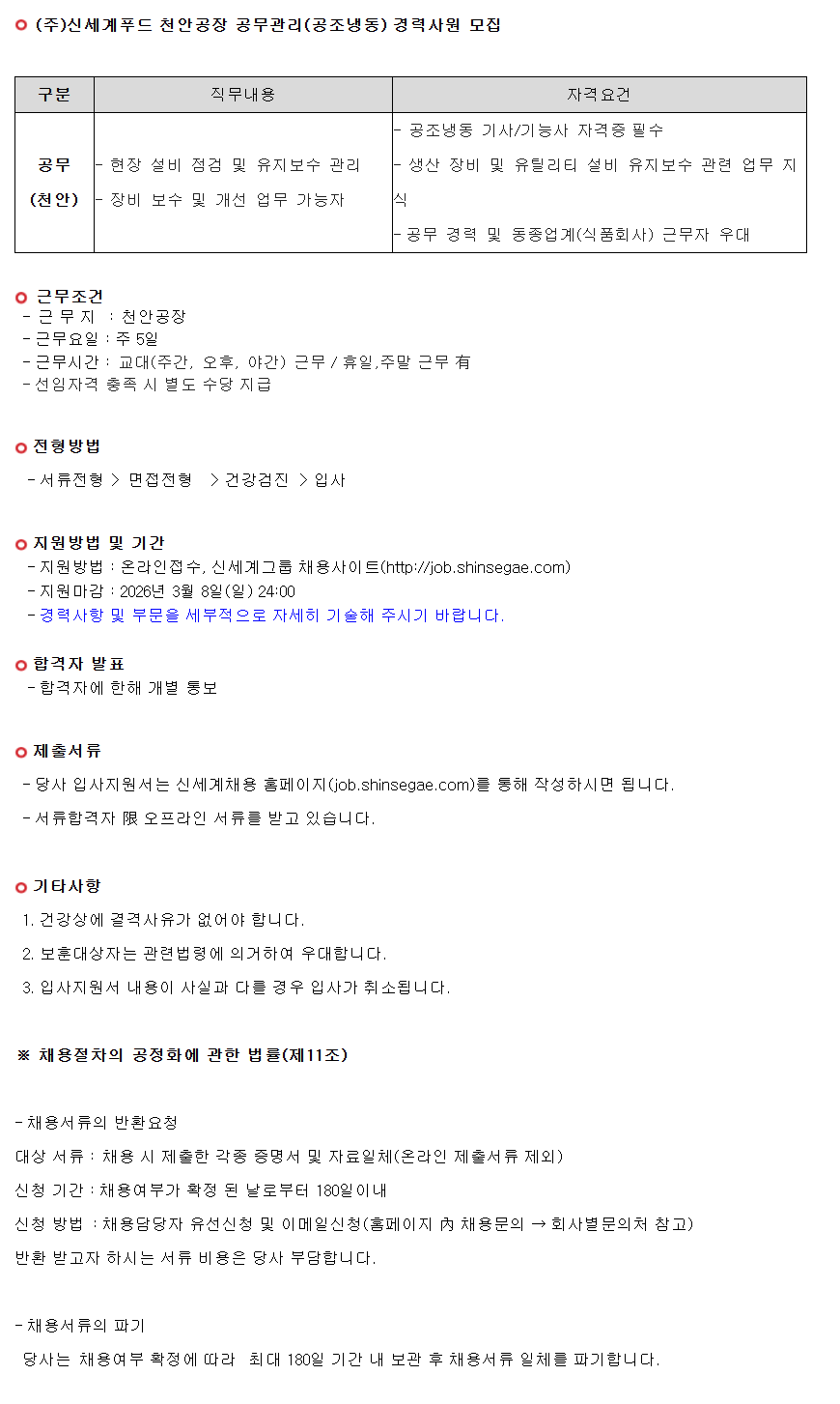 ±¸ºÐ Á÷¹«³»¿ë ÀÚ°Ý¿ä°Ç °ø¹« (õ¾È) - ÇöÀå ¼³ºñ Á¡°Ë ¹× À¯Áöº¸¼ö °ü¸® - Àåºñ º¸¼ö ¹× °³¼± ¾÷¹« °¡´ÉÀÚ - °øÁ¶³Ãµ¿ ±â»ç/±â´É»ç ÀÚ°ÝÁõ Çʼö - »ý»ê Àåºñ ¹× À¯Æ¿¸®Æ¼ ¼³ºñ À¯Áöº¸¼ö °ü·Ã ¾÷¹« Áö½Ä - °ø¹« °æ·Â ¹× µ¿Á¾¾÷°è(½Äǰȸ»ç) ±Ù¹«ÀÚ ¿ì