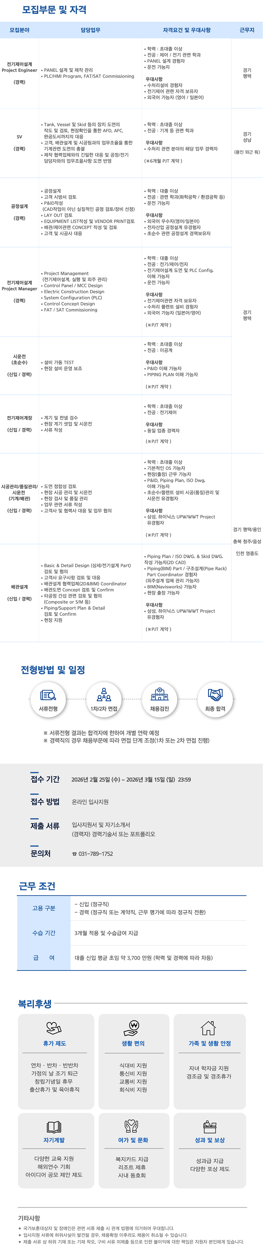 KURITA HANSU WaterIndustriesLtd. 2026³â Äí¸®Å¸ÇѼö ½ÅÀÔ¡¤°æ·Â»ç¿ø ä¿ë ¹°ÀÇ ¹«ÇÑÇÑ ÀáÀç°¡Ä¡¸¦ ¹ß±¼ÇÏ¿© ÀηùÀÇ ¹Ì·¡¿¡ °øÇåÇÑ´Ù " Äí¸®Å¸ÇѼö ÁÖ½Äȸ»ç´Â ¼öó¸® Ç÷£Æ® Àü¹®±â¾÷ 'ÇѼöÅ×Å©´ÏÄ®¼­ºñ½º ÁÖ½Äȸ»ç'¿Í ¼öó¸® ¾àǰ ¹× ¼³ºñ Àü¹® ±â¾÷ 'ÁÖ½Äȸ»ç ÇѼö'°¡ ÇÕº´µÈ Á¾ÇÕ ¼öó¸® Àü¹® ±â¾÷ÀÔ´Ï´Ù. ÀϺ» KURITA WATER INDUSTRIES LTD.¸¦ ¸ð±â¾÷À¸·Î Çϸç, µ¶º¸ÀûÀÎ ±â¼ú·ÂÀ¸·Î ÀÏ¹Ý Á¤¼ö½Ã½ºÅÛ¿¡¼­ºÎÅÍ ÃÖ÷´Ü ¹ÝµµÃ¼¿ë Ãʼø¼ö ¹× Æó¼öÀçȰ¿ë ½Ã½ºÅÛ¿¡ À̸£±â±îÁö, »ê¾÷ Àü ºÐ¾ß¿¡ ÇÊ¿äÇÑ ¼öó¸® ¼³ºñÀÇ ¼³°è Á¦ÀÛ ½Ã°ø ½Ã¿îÀü ¡¤ Operation/Maintenance ¹× ¾àǰ ¡¤ ÀåÄ¡ ¼¼Á¤¼­ºñ½º¸¦ Á¦°øÇÏ¿© °í°´ÀÇ ¸ðµç Needs¿¡ ´ëÀÀÇÕ´Ï´Ù. ¸ðÁýºÎ¹® ¹× ÀÚ°Ý ¸ðÁýºÐ¾ß ´ã´ç¾÷¹« ÀÚ°Ý¿ä°Ç ¹× ¿ì´ë»çÇ× ±Ù¹«Áö Çз : ÃÊ´ëÁ¹ ÀÌ»ó Àü°ø: Á¦¾î / Àü±â °ü·Ã Çаú PANEL ¼³°è °æÇèÀÚ Àü±âÁ¦¾î¼³°è ¿îÀü °¡´ÉÀÚ Project Engineer ¡¤ PANEL ¼³°è ¹× Á¦ÀÛ °ü¸® °æ±â ¡¤PLC/HMI Program, FAT/SAT Commissioning ÆòÅà ¿ì´ë»çÇ× (°æ·Â) ¼ö󸮼³ºñ °æÇèÀÚ Àü±âÁ¦¾î °ü·Ã ÀÚ°Ý º¸À¯ÀÚ ¿Ü±¹¾î °¡´ÉÀÚ (¿µ¾î / ÀϺ»¾î) Tank, Vessel ¹× Skid µîÀÇ ÀåÄ¡ µµ¸éÀÇ Çз : ÃÊ´ëÁ¹ ÀÌ»ó ÀÛµµ ¹× °ËÅä, ÇöÀåÈ®ÀÎÀ» ÅëÇÑ AFD, AFC, ¡¤ Àü°ø: ±â°è µî °ü·Ã Çаú °æ±â SV ¿Ï°øµµ¼­±îÁöÀÇ ´ëÀÀ ¼º³² °í°´, ¹è°ü¼³°è ¹× ½Ã°øÆÀ°úÀÇ ¾÷¹«Á¶À²À» ÅëÇÑ ¿ì´ë»çÇ× (°æ·Â) ±â°è°ü·Ã µµ¸éÀÇ ÃѰý ¡¤ ¼öó¸® °ü·Ã ºÐ¾ßÀÇ ÇØ´ç ¾÷¹« °æ·ÂÀÚ (¿ëÀÎ ¿Ü±Ù êó) ¡¤Á¦ÀÛ Çù·Â¾÷ü¿ÍÀÇ ±ä¹ÐÇÑ ´ëÀÀ ¹× °øÁ¤/Àü±â ´ã´çÀÚ¿ÍÀÇ ¾÷¹«Á¶À²»çÇ× µµ¸é ¹Ý¿µ (¡Ø6°³¿ù PJT °è¾à) °øÁ¤¼³°è Çз : ´ëÁ¹ ÀÌ»ó °í°´ ½Ã¹æ¼­ °ËÅä Àü°ø: °ü·Ã Çаú(È­ÇаøÇÐ/ȯ°æ°øÇеî) ¡¤ P&IDÀÛ¼º ¿îÀü °¡´ÉÀÚ °øÁ¤¼³°è (CADÀÛ¾÷ÀÌ ¾Æ´Ñ ½ÇÁúÀûÀÎ °øÁ¤ °ËÅä/Àåºñ ¼±Á¤) ¡¤LAY OUT °ËÅä ¿ì´ë»çÇ× (°æ·Â) EQUIPMENT LISTÀÛ¼º ¹× VENDOR PRINT°ËÅä ¡¤ ¿Ü±¹¾î ¿ì¼öÀÚ(¿µ¾î/ÀϺ»¾î) ¹è°ü/Á¦¾î°ü·Ã CONCEPT ÀÛ¼º ¹× °ËÅä ÀüÀÚ»ê¾÷ °øÁ¤¼³°è À¯°æÇèÀÚ °í°´ ¹× ½Ã°ø»ç ´ëÀÀ Ãʼø¼ö °ü·Ã °øÁ¤¼³°è °æ·Âº¸À¯ÀÚ ¡¤ Çз : ´ëÁ¹ ÀÌ»ó ¡¤ Àü°ø : Àü±â/Á¦¾î/ÀüÀÚ Àü±âÁ¦¾î¼³°è µµ¸é ¹× PLC Config. ¡¤ Project Management ÀÌÇØ °¡´ÉÀÚ (Àü±âÁ¦¾î¼³°è, ½ÇÇà ¹× ¿ÜÁÖ °ü¸®) Àü±âÁ¦¾î¼³°è ¡¤ ¿îÀü °¡´ÉÀÚ Control Panel / MCC Design Project Manager Electric Construction Design ¿ì´ë»çÇ× ¡¤ System Configuration (PLC) (°æ·Â) ¡¤ Àü±âÁ¦¾î°ü·Ã ÀÚ°Ý º¸À¯ÀÚ ¡¤ Control Concept Design ¼öó¸® Ç÷£Æ® ¼³ºñ °æÇèÀÚ ¡¤FAT / SAT Commissioning ¿Ü±¹¾î °¡´ÉÀÚ (ÀϺ»¾î/¿µ¾î) °æ±â ÆòÅà (¡ØPJT °è¾à) Çз : ÃÊ´ëÁ¹ ÀÌ»ó Àü°ø : À̰ø°è ½Ã¿îÀü (Ãʼø¼ö) ¼³ºñ °¡µ¿ TEST ¿ì´ë»çÇ× ÇöÀå ¼³ºñ ¿î¿µ º¸Á¶ P&ID ÀÌÇØ °¡´ÉÀÚ (½ÅÀÔ / °æ·Â) PIPING PLAN ÀÌÇØ °¡´ÉÀÚ (¡ØPJT °è¾à) Çз : ÃÊ´ëÁ¹ ÀÌ»ó ¡¤ Àü°ø : Àü±âÁ¦¾î Àü±âÁ¦¾î°èÀå ¡¤°è±â ¹× ÆÇ³Ú °Ë¼ö ÇöÀå °è±â ¼Â¾÷ ¹× ½Ã¿îÀü ¿ì´ë»çÇ× (½ÅÀÔ / °æ·Â) ¡¤¼­·ù ÀÛ¼º ¡¤ µ¿ÀÏ ¾÷Á¾ °æ·ÂÀÚ (¡ØPJT °è¾à) Çз : ÃÊ´ëÁ¹ ÀÌ»ó ±âº»ÀûÀÎ os °¡´ÉÀÚ ÇöÀå(ÃâÀå) ±Ù¹« °¡´ÉÀÚ ¡¤ P&ID, Piping Plan, ISO Dwg. ½Ã°ø°ü¸®/ǰÁú°ü¸®/ ¡¤ µµ¸é Á¤ÇÕ¼º °ËÅä ÀÌÇØ °¡´ÉÀÚ ½Ã¿îÀü ÇöÀå ½Ã°ø °ü¸® ¹× ½Ã¿îÀü ¡¤ Ãʼø¼ö/Ç÷£Æ® ¼³ºñ ½Ã°ø(ǰÁú)°ü¸® ¹× (±â°è/¹è°ü) ¡¤ ÇöÀå °Ë»ç ¹× Ç°Áú °ü¸® ½Ã¿îÀü À¯°æÇèÀÚ ¾÷¹« °ü·Ã ¼­·ù ÀÛ¼º (½ÅÀÔ / °æ·Â) °í°´»ç ¹× Çù·Â»ç ´ëÀÀ ¹× ¾÷¹« ÇùÀÇ ¿ì´ë»çÇ× ¡¤ »ï¼º, ÇÏÀ̴нº UPW/WWT Project À¯°æÇèÀÚ °æ±â ÆòÅÃ/¿ëÀÎ (¡ØPJT °è¾à) ÃæºÏ ûÁÖ/À½¼º ÀÎõ ¿µÁ¾µµ Piping Plan / ISO DWG. & Skid DWG. ÀÛ¼º °¡´ÉÀÚ(2D CAD) Basic & Detail Design (»ó¼¼/Àü±â¼³°è Part) Piping(BIM) Part/ ±¸Á¶¼³°è(Pipe Rack) °ËÅä ¹× ÇùÀÇ Part Coordinator °æÇèÀÚ °í°´»ç ¿ä±¸»çÇ× °ËÅä ¹× ´ëÀÀ (¿ÜÁÖ¼³°è ¾÷ü °ü¸® °¡´ÉÀÚ) ¹è°ü¼³°è Çù·Â¾÷ü(2D&BIM) Coordinator ¹è°ü¼³°è BIM(Navisworks) °¡´ÉÀÚ ¹è°üµµ¸é Concept °ËÅä ¹× Confirm ÇöÀå ÃâÀå °¡´ÉÀÚ Å¸°øÁ¤ °£¼· °ü·Ã °ËÅä ¹× ÇùÀÇ (½ÅÀÔ / °æ·Â) (Composite or S/M µî) ¿ì´ë»çÇ× ¡¤ Piping/Support Plan & Detail ¡¤ »ï¼º, ÇÏÀ̴нº UPW/WWT Project °ËÅä ¹× Confirm À¯°æÇèÀÚ ÇöÀå Áö¿ø (¡ØPJT °è¾à) ÀüÇü¹æ¹ý ¹× ÀÏÁ¤ 8 888 ¹Ì ¼­·ùÀüÇü 1Â÷/2Â÷ ¸éÁ¢ ä¿ë°ËÁø ÃÖÁ¾ ÇÕ°Ý ¡Ø ¼­·ùÀüÇü °á°ú´Â ÇÕ°ÝÀÚ¿¡ ÇÑÇÏ¿© °³º° ¿¬¶ô ¿¹Á¤ ¡Ø °æ·ÂÁ÷ÀÇ °æ¿ì ä¿ëºÎ¹®¿¡ µû¶ó ¸éÁ¢ ´Ü°è Á¶Á¤(1Â÷ ¶Ç´Â 2Â÷ ¸éÁ¢ ÁøÇà) Á¢¼ö ±â°£ 2026³â 2¿ù 25ÀÏ (¼ö) ~ 2026³â 3¿ù 15ÀÏ (ÀÏ) 23:59 Á¢¼ö ¹æ¹ý ¿Â¶óÀÎ ÀÔ»çÁö¿ø Á¦Ãâ ¼­·ù ÀÔ»