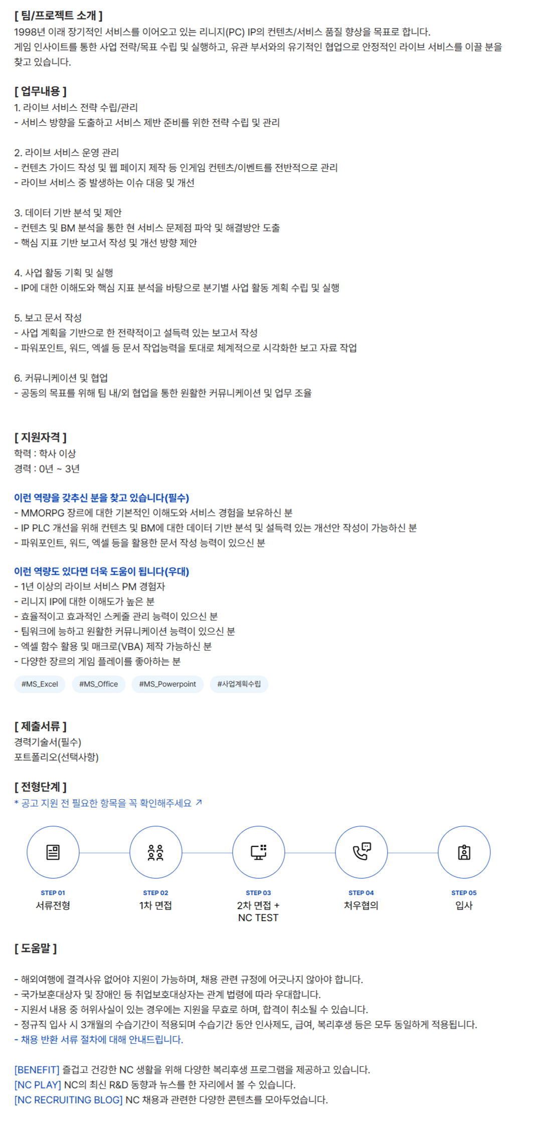 [ ÆÀ/ÇÁ·ÎÁ§Æ® ¼Ò°³ ] 1998³â ÀÌ·¡ Àå±âÀûÀÎ ¼­ºñ½º¸¦ À̾î¿À°í ÀÖ´Â ¸®´ÏÁö(PC) IPÀÇ ÄÁÅÙÃ÷/¼­ºñ½º ǰÁú Çâ»óÀ» ¸ñÇ¥·Î ÇÕ´Ï´Ù. °ÔÀÓ ÀλçÀÌÆ®¸¦ ÅëÇÑ »ç¾÷ Àü·«/¸ñÇ¥ ¼ö¸³ ¹× ½ÇÇàÇϰí, À¯°ü ºÎ¼­¿ÍÀÇ À¯±âÀûÀÎ Çù¾÷À¸·Î ¾ÈÁ¤ÀûÀÎ ¶óÀÌºê ¼­ºñ½º¸¦ À̲ø ºÐÀ» ã°í ÀÖ½À´Ï´Ù. [ ¾÷¹«³»¿ë ] 1. ¶óÀÌºê ¼­ºñ½º Àü·« ¼ö¸³/°ü¸® - ¼­ºñ½º ¹æÇâÀ» µµÃâÇÏ°í ¼­ºñ½º Á¦¹Ý Áغñ¸¦ À§ÇÑ Àü·« ¼ö¸³ ¹× °ü¸® 2. ¶óÀÌºê ¼­ºñ½º ¿î¿µ °ü¸® - ÄÁÅÙÃ÷ °¡À̵å ÀÛ¼º ¹× À¥ ÆäÀÌÁö Á¦ÀÛ µî ÀΰÔÀÓ ÄÁÅÙÃ÷/À̺¥Æ®¸¦ Àü¹ÝÀûÀ¸·Î °ü¸® - ¶óÀÌºê ¼­ºñ½º Áß ¹ß»ýÇÏ´Â À̽´ ´ëÀÀ ¹× °³¼± 3. µ¥ÀÌÅÍ ±â¹Ý ºÐ¼® ¹× Á¦¾È - ÄÁÅÙÃ÷ ¹× BM ºÐ¼®À» ÅëÇÑ Çö ¼­ºñ½º ¹®Á¦Á¡ ÆÄ¾Ç ¹× ÇØ°á¹æ¾È µµÃâ - ÇÙ½É ÁöÇ¥ ±â¹Ý º¸°í¼­ ÀÛ¼º ¹× °³¼± ¹æÇâ Á¦¾È 4. »ç¾÷ Ȱµ¿ ±âȹ ¹× ½ÇÇà - IP¿¡ ´ëÇÑ ÀÌÇØµµ¿Í ÇÙ½É ÁöÇ¥ ºÐ¼®À» ¹ÙÅÁÀ¸·Î ºÐ±âº° »ç¾÷ Ȱµ¿ °èȹ ¼ö¸³ ¹× ½ÇÇà 5. º¸°í ¹®¼­ ÀÛ¼º - »ç¾÷ °èȹÀ» ±â¹ÝÀ¸·Î ÇÑ Àü·«ÀûÀÌ°í ¼³µæ·Â ÀÖ´Â º¸°í¼­ ÀÛ¼º - ÆÄ¿öÆ÷ÀÎÆ®, ¿öµå, ¿¢¼¿ µî ¹®¼­ ÀÛ¾÷´É·ÂÀ» Åä´ë·Î ü°èÀûÀ¸·Î ½Ã°¢È­ÇÑ º¸°í ÀÚ·á ÀÛ¾÷ 6. Ä¿¹Â´ÏÄÉÀÌ¼Ç ¹× Çù¾÷ - °øµ¿ÀÇ ¸ñÇ¥¸¦ À§ÇØ ÆÀ ³»/¿Ü Çù¾÷À» ÅëÇÑ ¿øÈ°ÇÑ Ä¿¹Â´ÏÄÉÀÌ¼Ç ¹× ¾÷¹« Á¶À² [ Áö¿øÀÚ°Ý ] Çз : Çлç ÀÌ»ó °æ·Â : 0³â ~ 3³â ÀÌ·± ¿ª·®À» °®Ã߽ŠºÐÀ» ã°í ÀÖ½À´Ï´Ù(Çʼö) - MMORPG À帣¿¡ ´ëÇÑ ±âº»ÀûÀÎ ÀÌÇØµµ¿Í ¼­ºñ½º °æÇèÀ» º¸À¯ÇϽŠºÐ - IP PLC °³¼±À» À§ÇØ ÄÁÅÙÃ÷ ¹× BM¿¡ ´ëÇÑ µ¥ÀÌÅÍ ±â¹Ý ºÐ¼® ¹× ¼³µæ·Â ÀÖ´Â °³¼±¾È ÀÛ¼ºÀÌ °¡´ÉÇϽŠºÐ - ÆÄ¿öÆ÷ÀÎÆ®, ¿öµå, ¿¢¼¿ µîÀ» Ȱ¿ëÇÑ ¹®¼­ ÀÛ¼º ´É·ÂÀÌ ÀÖÀ¸½Å ºÐ