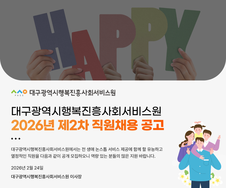 • º» ä¿ë°ø°í¹®Àº »çÁ¤¿¡ ÀÇÇÏ¿© º¯°æµÉ ¼ö ÀÖÀ¸¸ç, º¯°æ ½Ã¿¡´Â ä¿ëȨÆäÀÌÁö ¶Ç´Â ÁøÈï¿ø ȨÆäÀÌÁö(http://daegu.pass.or.kr/)¿¡ °ø°íÇÏ¿À´Ï ¼ö½Ã·Î È®ÀÎÇϽñ⠹ٶø´Ï´Ù.