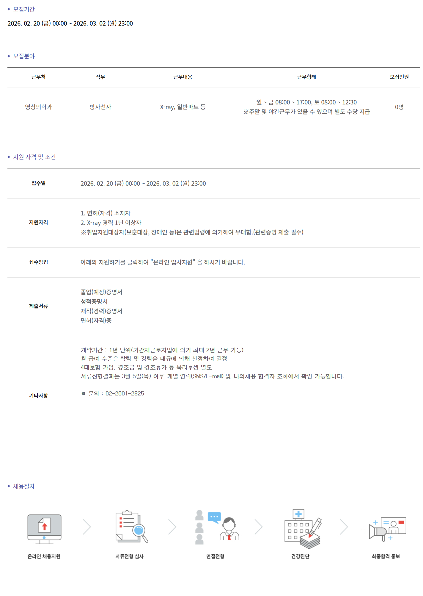 ±Ù¹«Ã³ Á÷¹« ±Ù¹«³»¿ë ±Ù¹«ÇüÅ ¸ðÁýÀοø ¿µ»óÀÇÇаú ¹æ»ç¼±»ç X-ray, ÀÏ¹ÝÆÄÆ® µî ¿ù ~ ±Ý 08:00 ~ 17:00, Åä 08:00 ~ 12:30 ¡ØÁÖ¸» ¹× ¾ß°£±Ù¹«°¡ ÀÖÀ» ¼ö ÀÖÀ¸¸ç º°µµ ¼ö´ç Áö±Þ 0¸í