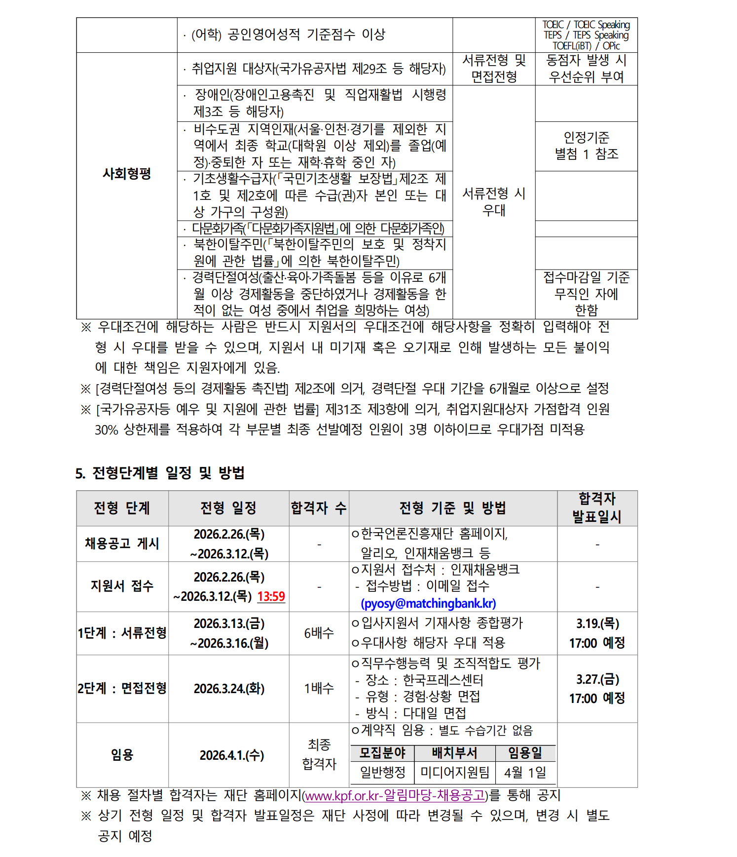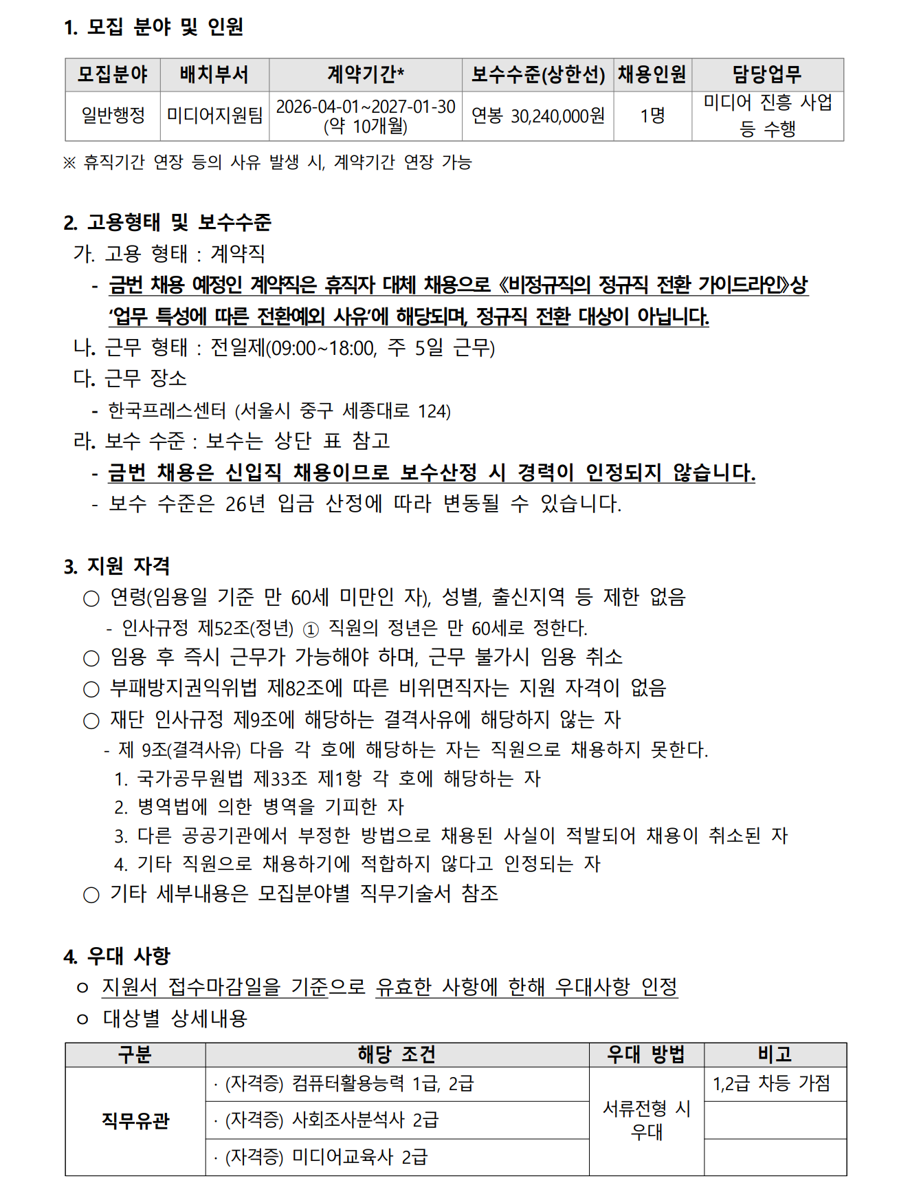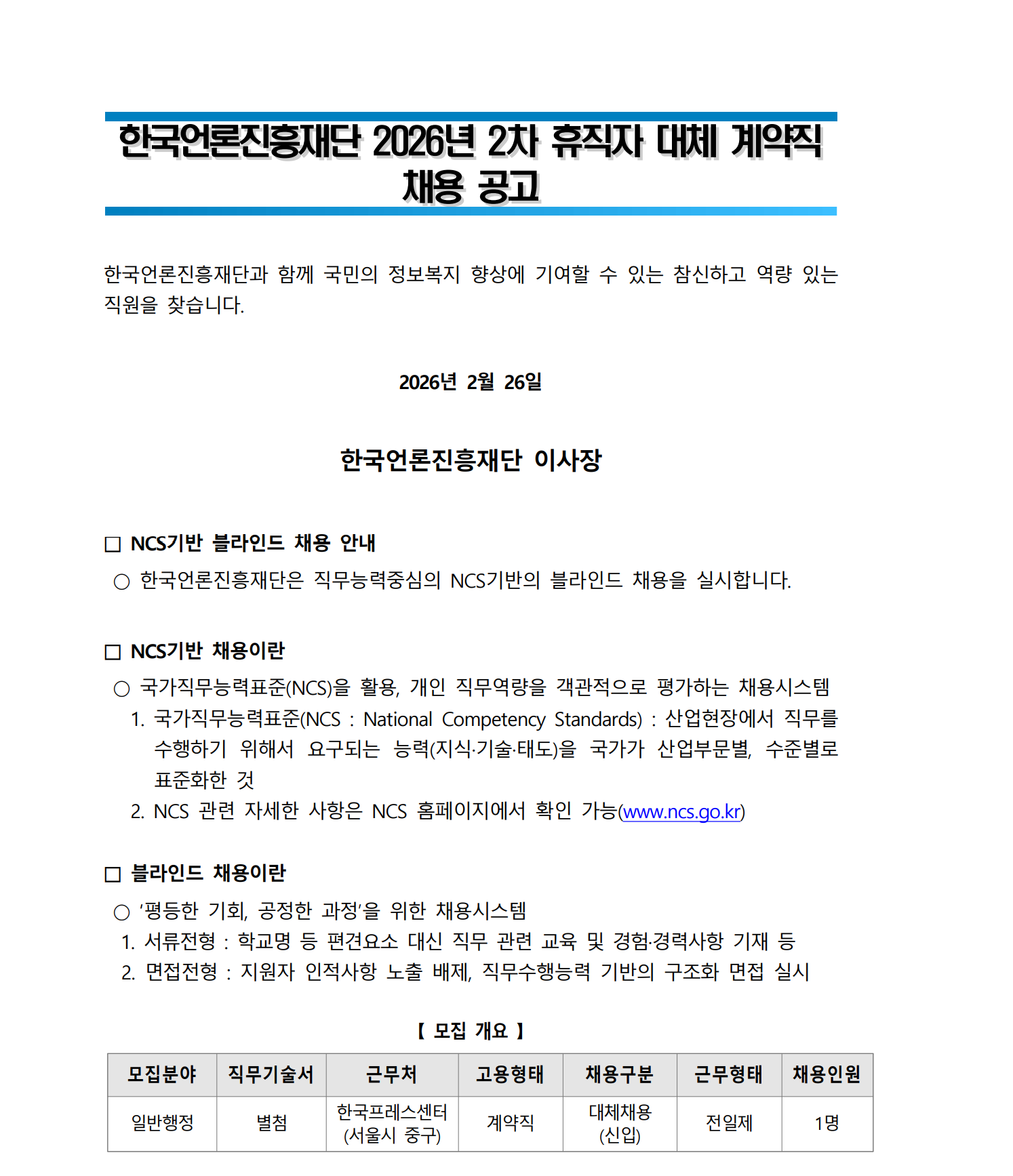 Çѱ¹¾ð·ÐÁøÈïÀç´Ü Çѱ¹¾ð·ÐÁøÈïÀç´Ü 2026 2026³â ³â 22Â÷ Â÷ ÈÞÁ÷ÀÚ ÈÞÁ÷ÀÚ ´ëü ´ëü °è¾àÁ÷ °è¾àÁ÷ ․ ä¿ë °ø°í Çѱ¹¾ð·ÐÁøÈïÀç´Ü°ú ÇÔ²² ±¹¹ÎÀÇ Á¤º¸º¹Áö Çâ»ó¿¡ ±â¿©ÇÒ ¼ö ÀÖ´Â Âü½ÅÇÏ°í ¿ª·® ÀÖ´Â Á÷¿øÀ» ã½À´Ï´Ù. 2026³â 2¿ù 26ÀÏ Çѱ¹¾ð·ÐÁøÈïÀç´Ü ÀÌ»çÀå ¡à NCS±â¹Ý ºí¶óÀεå ä¿ë ¾È³» ¡Û Çѱ¹¾ð·ÐÁøÈïÀç´ÜÀº Á÷¹«´É·ÂÁß½ÉÀÇ NCS±â¹ÝÀÇ ºí¶óÀεå ä¿ëÀ» ½Ç½ÃÇÕ´Ï´Ù. ¡à NCS±â¹Ý ä¿ëÀ̶õ ¡Û ±¹°¡Á÷¹«´É·ÂÇ¥ÁØ(NCS)À» Ȱ¿ë, °³ÀÎ Á÷¹«¿ª·®À» °´°üÀûÀ¸·Î Æò°¡Çϴ ä¿ë½Ã½ºÅÛ 1. ±¹°¡Á÷¹«´É·ÂÇ¥ÁØ(NCS : National Competency Standards) : »ê¾÷ÇöÀå¿¡¼ Á÷¹«¸¦ ¼öÇàÇϱâ À§Çؼ ¿ä±¸µÇ´Â ´É·Â(Áö½Ä¡¤±â¼ú¡¤Åµµ)À» ±¹°¡°¡ »ê¾÷ºÎ¹®º°, ¼öÁغ°·Î Ç¥ÁØÈÇÑ °Í 2. NCS °ü·Ã ÀÚ¼¼ÇÑ »çÇ×Àº NCS ȨÆäÀÌÁö¿¡¼ È®ÀÎ °¡´É(www.ncs.go.kr) ¡à ºí¶óÀεå ä¿ëÀ̶õ ¡Û ¡®ÆòµîÇÑ ±âȸ, °øÁ¤ÇÑ °úÁ¤¡¯À» À§ÇÑ Ã¤¿ë½Ã½ºÅÛ 1. ¼·ùÀüÇü : Çб³¸í µî Æí°ß¿ä¼Ò ´ë½Å Á÷¹« °ü·Ã ±³À° ¹× °æÇ衤°æ·Â»çÇ× ±âÀç µî 2. ¸éÁ¢ÀüÇü : Áö¿øÀÚ ÀÎÀû»çÇ× ³ëÃâ ¹èÁ¦, Á÷¹«¼öÇà´É·Â ±â¹ÝÀÇ ±¸Á¶È ¸éÁ¢ ½Ç½Ã ¡¼ ¸ðÁý °³¿ä ¡½ ¸ðÁýºÐ¾ß Á÷¹«±â¼ú¼ ±Ù¹«Ã³ °í¿ëÇüÅ ä¿ë±¸ºÐ ±Ù¹«ÇüÅ ä¿ëÀοø ÀϹÝÇàÁ¤ º°Ã· Çѱ¹ÇÁ·¹½º¼¾ÅÍ (¼¿ï½Ã Áß±¸) °è¾àÁ÷ ´ëüä¿ë (½ÅÀÔ) ÀüÀÏÁ¦ 1¸í