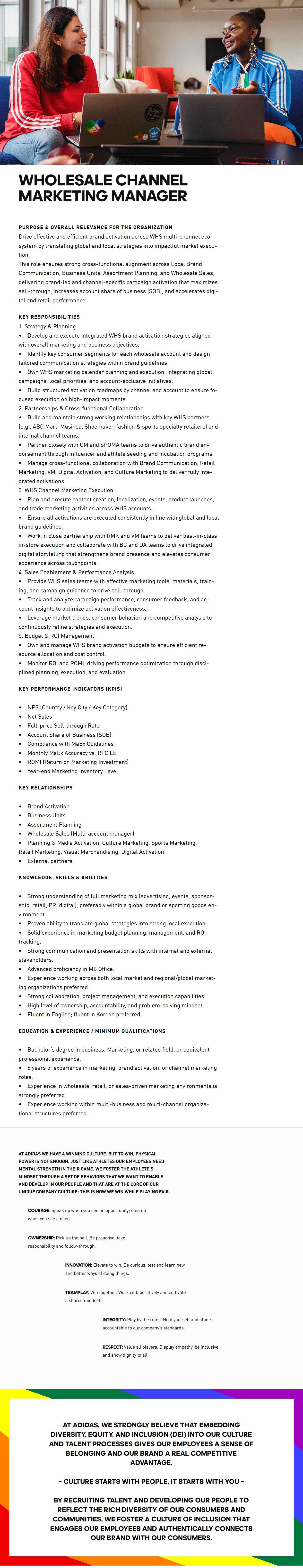• Build and maintain strong working relationships with key WHS partners (e.g., ABC Mart, Musinsa, Shoemaker, fashion & sports specialty retailers) and internal channel teams.
