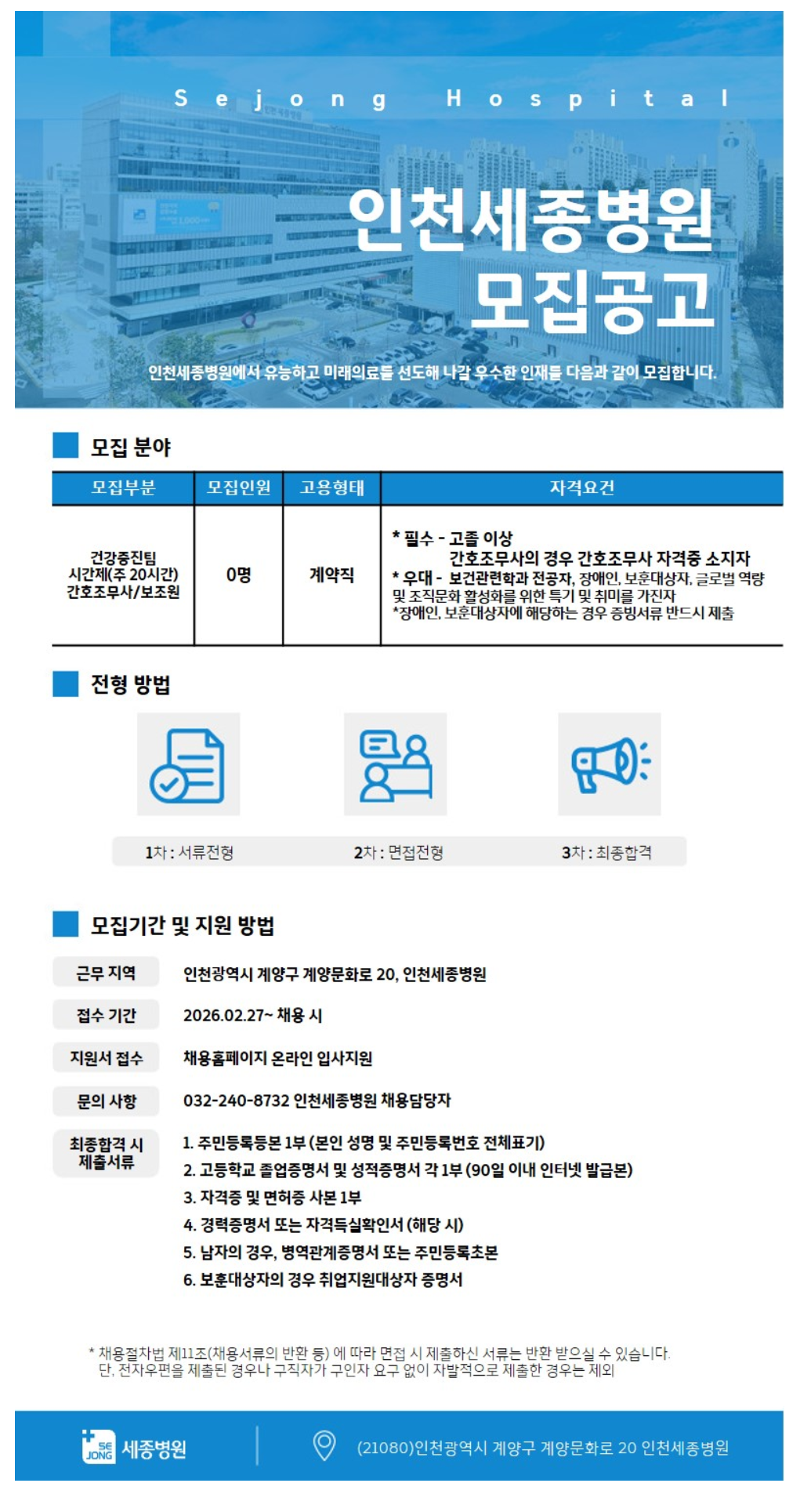 [ÀÎõ¼¼Á¾º´¿ø] °Ç°ÁõÁøÆÀ ½Ã°£Á¦ °£È£Á¶¹«»ç/º¸Á¶¿ø ä¿ë(°è¾àÁ÷)
