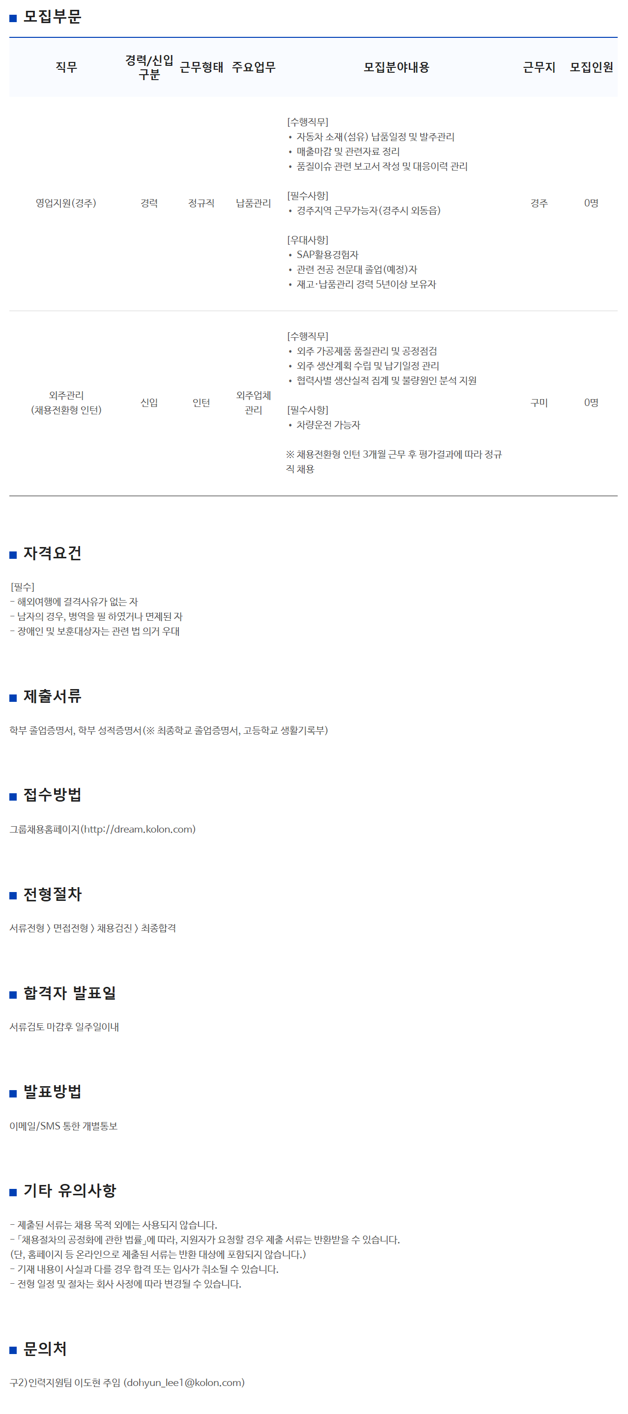 Á÷¹« °æ·Â/½ÅÀÔ ±¸ºÐ ±Ù¹«ÇüÅ ÁÖ¿ä¾÷¹« ¸ðÁýºÐ¾ß³»¿ë ±Ù¹«Áö ¸ðÁýÀοø ¿µ¾÷Áö¿ø(°æÁÖ) °æ·Â Á¤±ÔÁ÷ ³³Ç°°ü¸® [¼öÇàÁ÷¹«] • ÀÚµ¿Â÷ ¼ÒÀç(¼¶À¯) ³³Ç°ÀÏÁ¤ ¹× ¹ßÁÖ°ü¸® • ¸ÅÃ⸶°¨ ¹× °ü·ÃÀÚ·á Á¤¸® • ǰÁúÀ̽´ °ü·Ã º¸°í¼­ ÀÛ¼º ¹× ´ëÀÀÀÌ·Â °ü¸® [Çʼö»çÇ×] • °æÁÖÁö¿ª ±Ù¹«°¡´ÉÀÚ(°æÁֽà ¿Üµ¿À¾) [¿ì´ë»çÇ×] • SAPȰ¿ë°æÇèÀÚ • °ü·Ã Àü°ø Àü¹®´ë Á¹¾÷(¿¹Á¤)ÀÚ • Àç°í¡¤³³Ç°°ü¸® °æ·Â 5³âÀÌ»ó º¸À¯ÀÚ °æÁÖ 0¸í ¿ÜÁÖ°ü¸® (ä¿ëÀüȯÇü ÀÎÅÏ) ½ÅÀÔ ÀÎÅÏ ¿ÜÁÖ¾÷ü °ü¸® [¼öÇàÁ÷¹«] • ¿ÜÁÖ °¡°øÁ¦Ç° ǰÁú°ü¸® ¹× °øÁ¤Á¡°Ë • ¿ÜÁÖ »ý»ê°èȹ ¼ö¸³ ¹× ³³±âÀÏÁ¤ °ü¸® • Çù·Â»çº° »ý»ê½ÇÀû Áý°è ¹× ºÒ·®¿øÀÎ ºÐ¼® Áö¿ø [Çʼö»çÇ×] • Â÷·®¿îÀü °¡´ÉÀÚ ¡Ø ä¿ëÀüȯÇü ÀÎÅÏ 3°³¿ù ±Ù¹« ÈÄ Æò°¡°á°ú¿¡ µû¶ó Á¤±ÔÁ÷ ä¿ë ±¸¹Ì 0¸í