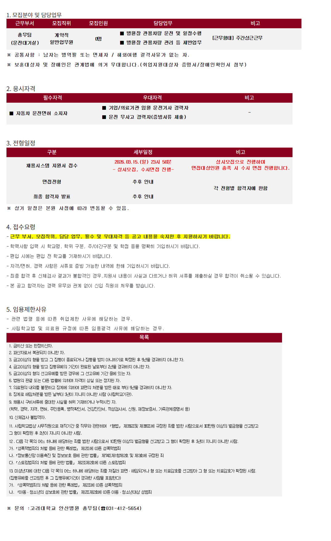[¾È»êº´¿ø26-1] Ãѹ«ÆÀ º´¿øÀå °ü¿ëÂ÷·® ¿îÀü(¿îÀü´ë±â½Ç) °è¾àÁ÷ÀϹݾ÷¹«¿ø ¸ðÁý