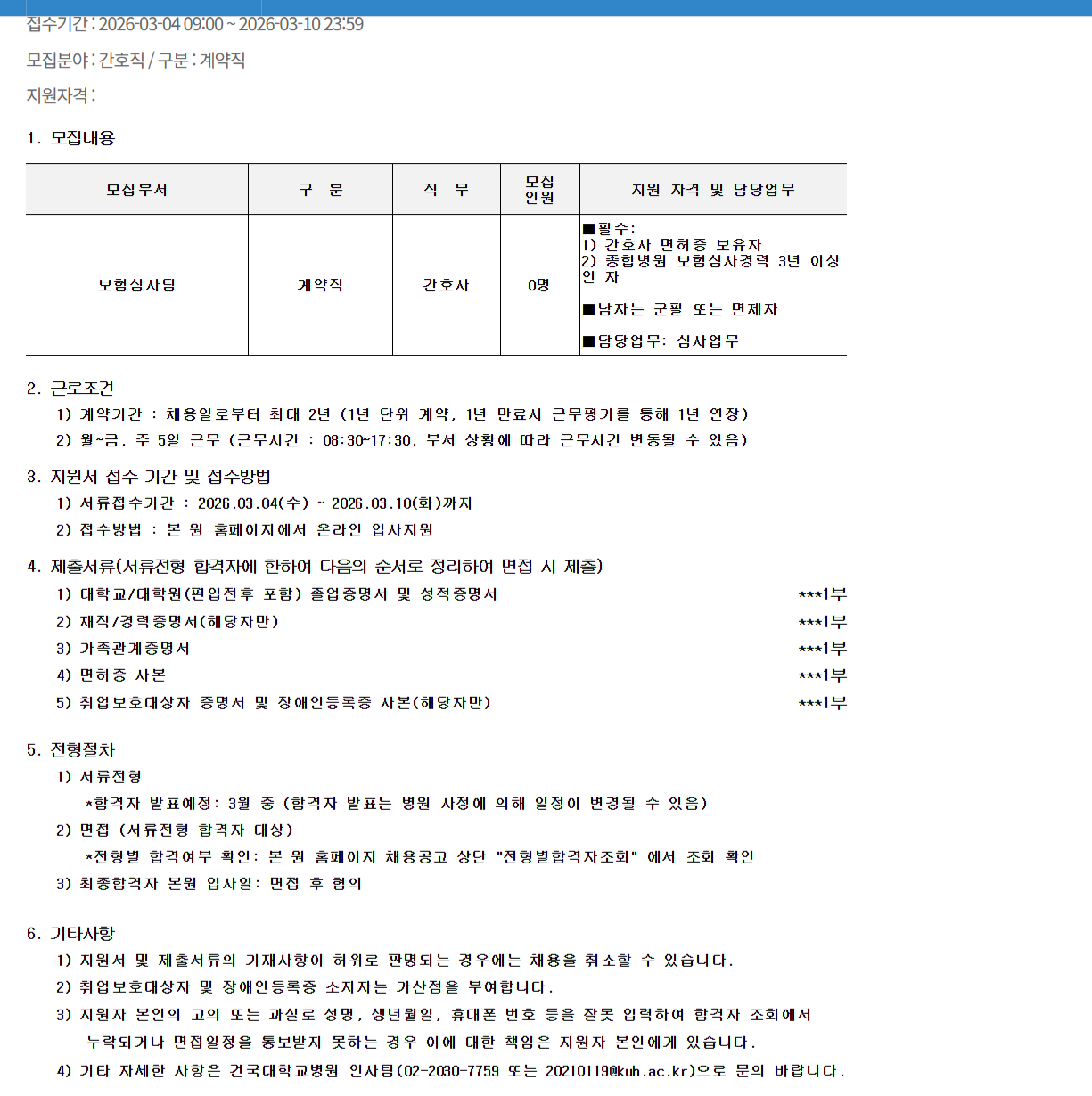¸ðÁýºÎ¼ ±¸ ºÐ Á÷ ¹« ¸ðÁý Àοø Áö¿ø ÀÚ°Ý ¹× ´ã´ç¾÷¹« º¸Çè½É»çÆÀ °è¾àÁ÷ °£È£»ç 0¸í ¡áÇʼö: 1) °£È£»ç ¸éÇãÁõ º¸À¯ÀÚ 2) Á¾ÇÕº´¿ø º¸Çè½É»ç°æ·Â 3³â ÀÌ»óÀÎ ÀÚ ¡á³²ÀÚ´Â ±ºÇÊ ¶Ç´Â ¸éÁ¦ÀÚ ¡á´ã´ç¾÷¹«: ½É»ç¾÷¹«