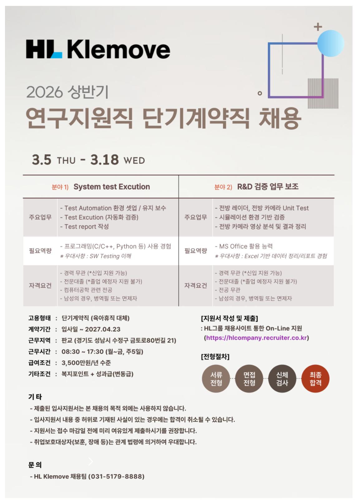 [HL Klemove] 2026 »ó¹Ý±â ¿¬±¸Áö¿øÁ÷ ´Ü±â°è¾àÁ÷ ä¿ë
