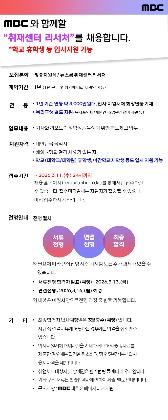 MBC ´º½º·ë ÃëÀç¼¾ÅÍ ¹æ¼ÛÁö¿øÁ÷(¸®¼Ã³) ´ã´ç ¸ðÁý(´ëÇб³ ÈÞÇлý µî ÀÔ»çÁö¿ø °¡´É)