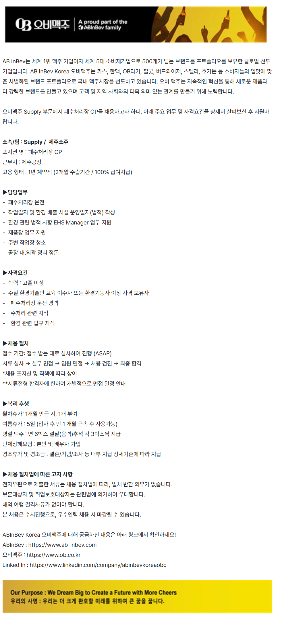 ¿Àºñ¸ÆÁÖ Supply ºÎ¹®¿¡¼ Æó¼öó¸®Àå OP¸¦ ä¿ëÇϰíÀÚ ÇÏ´Ï, ¾Æ·¡ ÁÖ¿ä ¾÷¹« ¹× ÀÚ°Ý¿ä°ÇÀ» »ó¼¼È÷ »ìÆìº¸½Å ÈÄ Áö¿ø¹Ù¶ø´Ï´Ù.