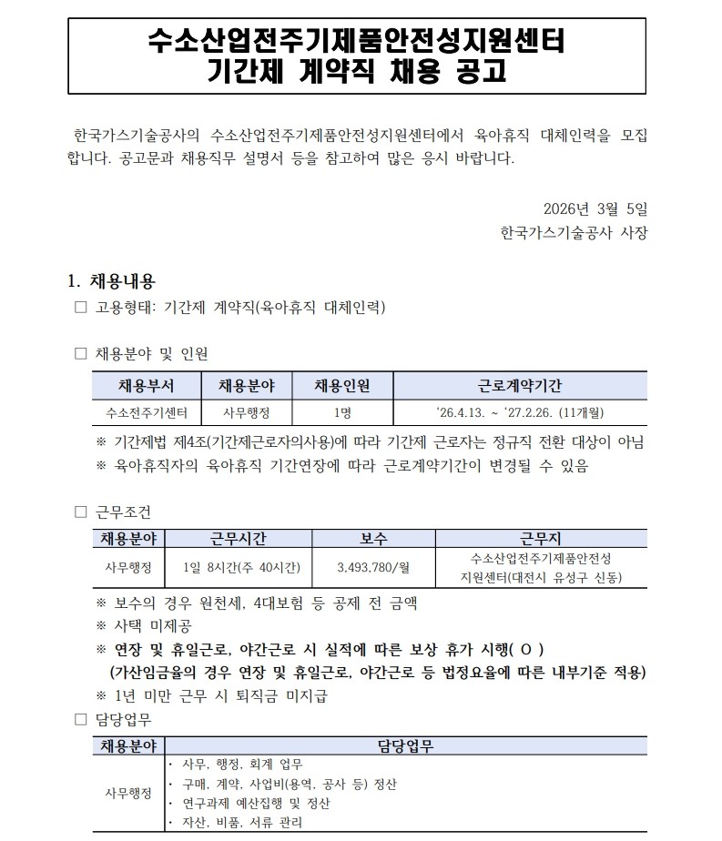 ÇÕ°Ý ÈÄ Ã¤¿ë½Ã, (ÁÖ)Çѱ¹°¡½º±â¼ú°ø»ç ¼Ò¼Ó °è¾àÁ÷À¸·Î ±Ù¹«ÇÏ°Ô µË´Ï´Ù.