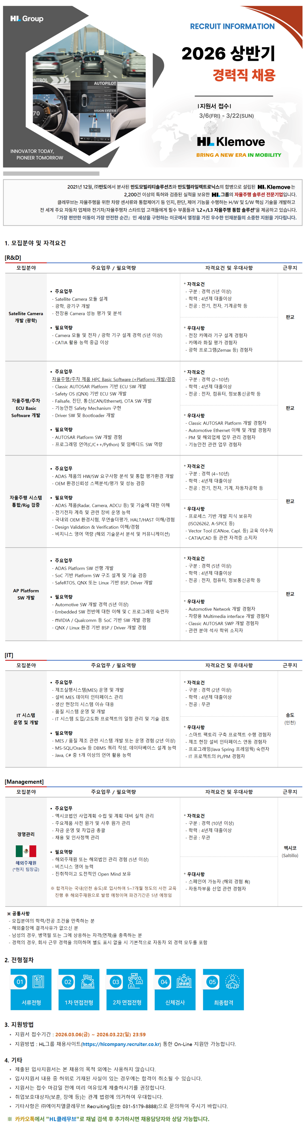 [HL Klemove] 2026 »ó¹Ý±â °æ·ÂÁ÷ ä¿ë (R&D, IT, °æ¿µ°ü¸®(ÇØ¿ÜÁÖÀç¿ø))
