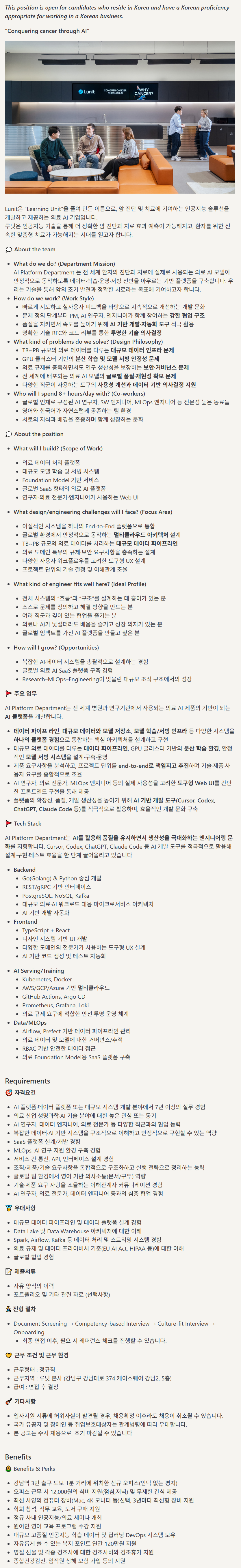 AI Platform Department ´Â Àü ¼¼°è ȯÀÚÀÇ Áø´Ü°ú Ä¡·á¿¡ ½ÇÁ¦·Î »ç¿ëµÇ´Â ÀÇ·á AI ¸ðµ¨ÀÌ ¾ÈÁ¤ÀûÀ¸·Î µ¿ÀÛÇϵµ·Ï µ¥ÀÌÅÍ¡¤ÇнÀ¡¤¿î¿µ¡¤¼ºù Àü¹ÝÀ» ¾Æ¿ì¸£´Â ±â¹Ý Ç÷§ÆûÀ» ±¸ÃàÇÕ´Ï´Ù. ¿ì¸®´Â ±â¼úÀ» ÅëÇØ ¾ÏÀÇ Á¶±â ¹ß°ß°ú Á¤È®ÇÑ Ä¡·á¶ó´Â ¸ñÇ¥¿¡ ±â¿©ÇϰíÀÚ ÇÕ´Ï´Ù.