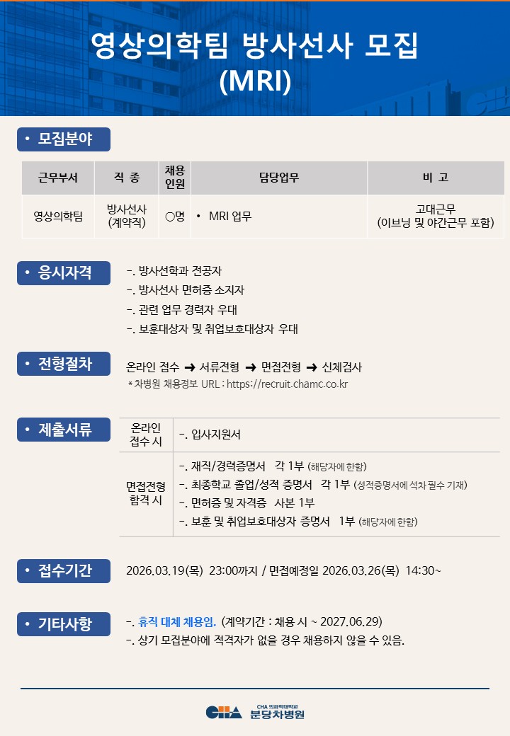 [ºÐ´çÂ÷º´¿ø] ¿µ»óÀÇÇÐÆÀ ¹æ»ç¼±»ç ¸ðÁý(MRI)