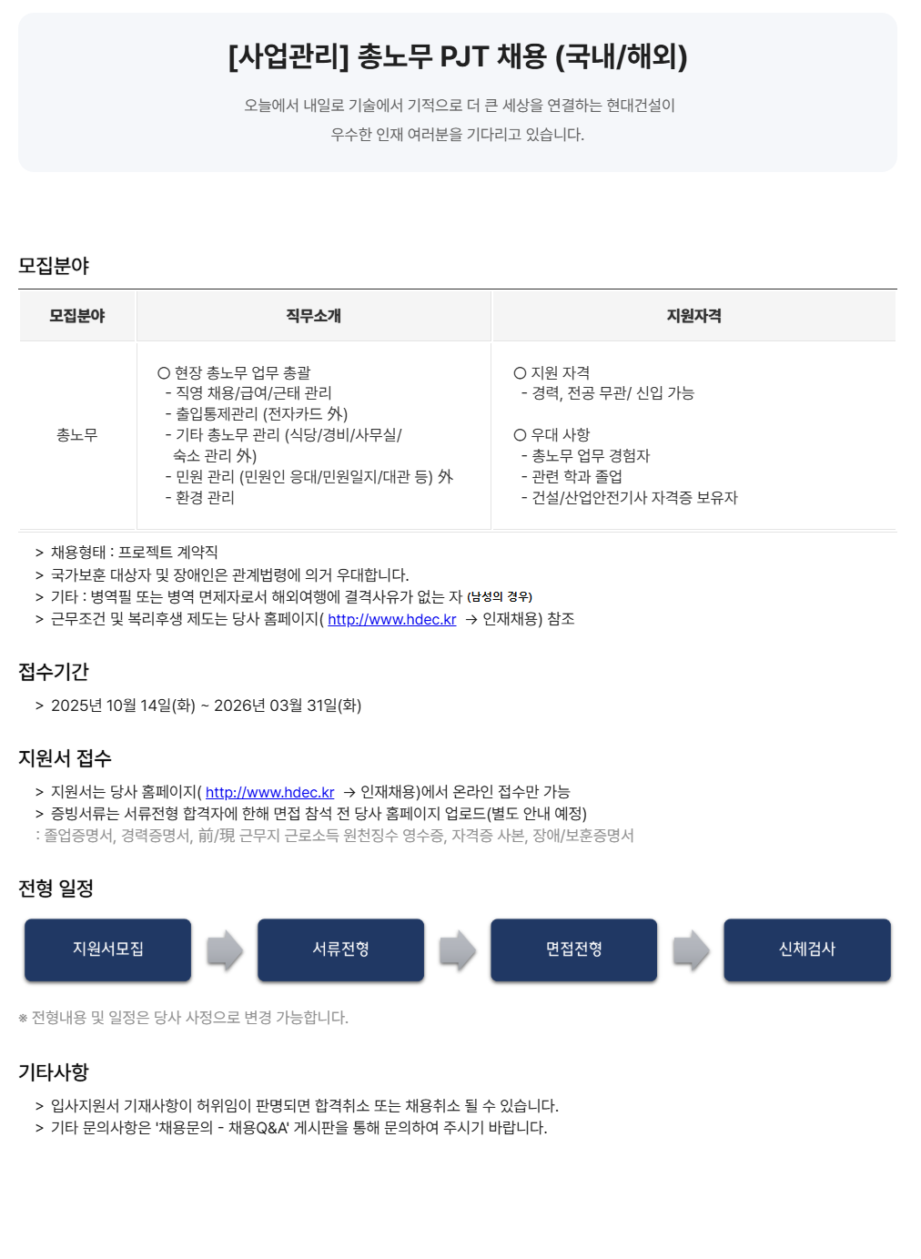 £¾ Áö¿ø¼´Â ´ç»ç ȨÆäÀÌÁö( http://www.hdec.kr ¡æ ÀÎÀçä¿ë)¿¡¼ ¿Â¶óÀÎ Á¢¼ö¸¸ °¡´É