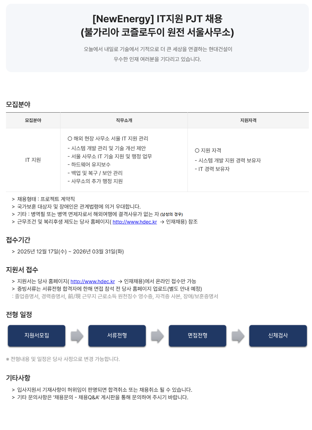 [NewEnergy] ITÁö¿ø PJT ä¿ë (ºÒ°¡¸®¾Æ ÄÚÁñ·ÎµÎÀÌ ¿øÀü ¼­¿ï»ç¹«¼Ò) ¿À´Ã¿¡¼­ ³»ÀÏ·Î ±â¼ú¿¡¼­ ±âÀûÀ¸·Î ´õ Å« ¼¼»óÀ» ¿¬°áÇÏ´Â Çö´ë°Ç¼³ÀÌ ¿ì¼öÇÑ ÀÎÀç ¿©·¯ºÐÀ» ±â´Ù¸®°í ÀÖ½À´Ï´Ù. ¸ðÁýºÐ¾ß ¸ðÁýºÐ¾ß Á÷¹«¼Ò°³ Áö¿øÀÚ°Ý IT Áö¿ø ¡Û ÇØ¿Ü ÇöÀå »ç¹«¼Ò ¼­¿ï IT Áö¿ø °ü¸® - ½Ã½ºÅÛ °³¹ß °ü¸® ¹× ±â¼ú °³¼± Á¦¾È - ¼­¿ï »ç¹«¼Ò IT ±â¼ú Áö¿ø ¹× ÇàÁ¤ ¾÷¹« - Çϵå¿þ¾î À¯Áöº¸¼ö - ¹é¾÷ ¹× º¹±¸ / º¸¾È °ü¸® - »ç¹«¼ÒÀÇ Ãß°¡ ÇàÁ¤ Áö¿ø ¡Û Áö¿ø ÀÚ°Ý - ½Ã½ºÅÛ °³¹ß Áö¿ø °æ·Â º¸À¯ÀÚ - IT °æ·Â º¸À¯ÀÚ