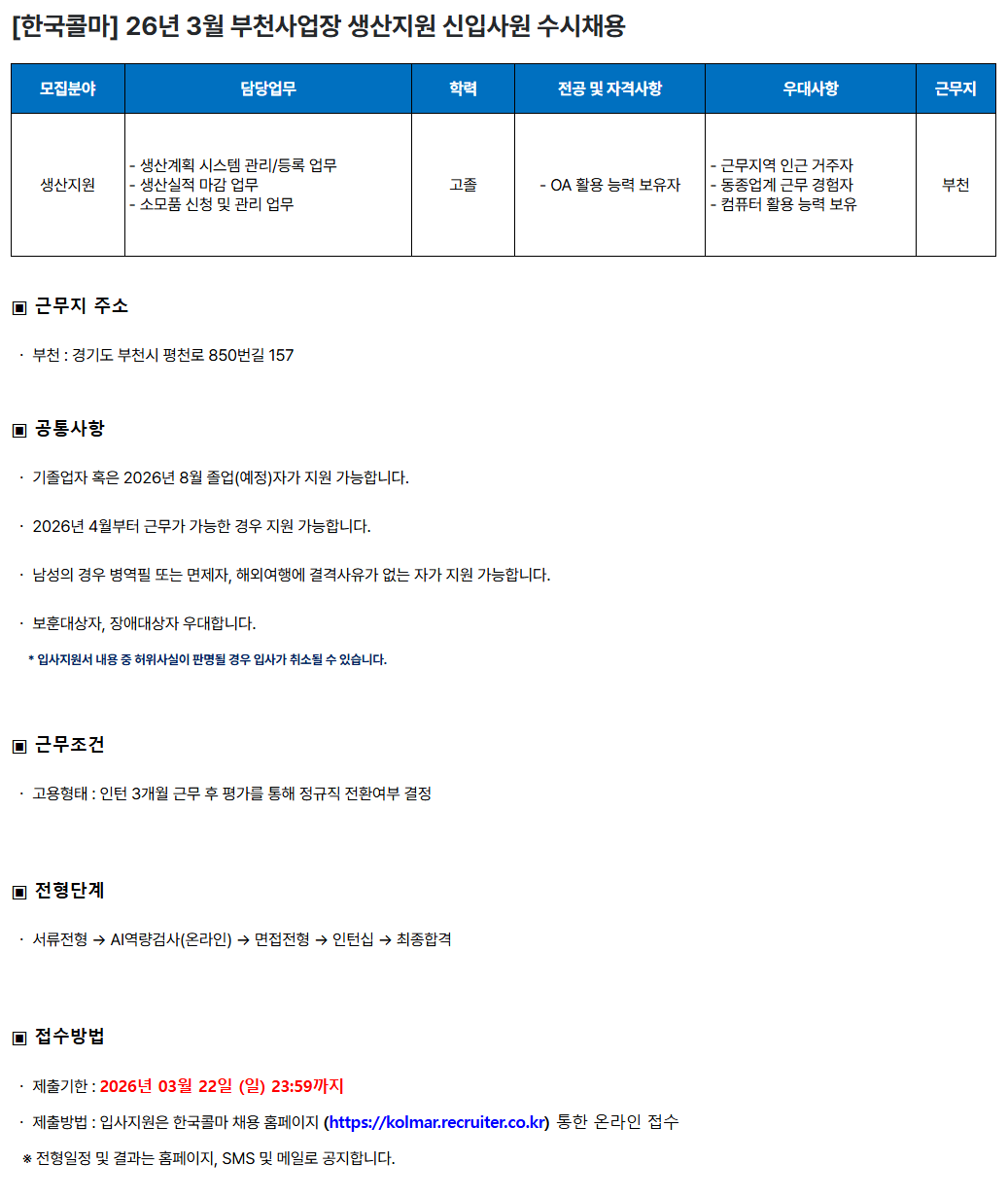 [Çѱ¹Äݸ¶] 26³â 3¿ù ºÎõ»ç¾÷Àå »ý»êÁö¿ø ½ÅÀÔ»ç¿ø ¼ö½Ãä¿ë