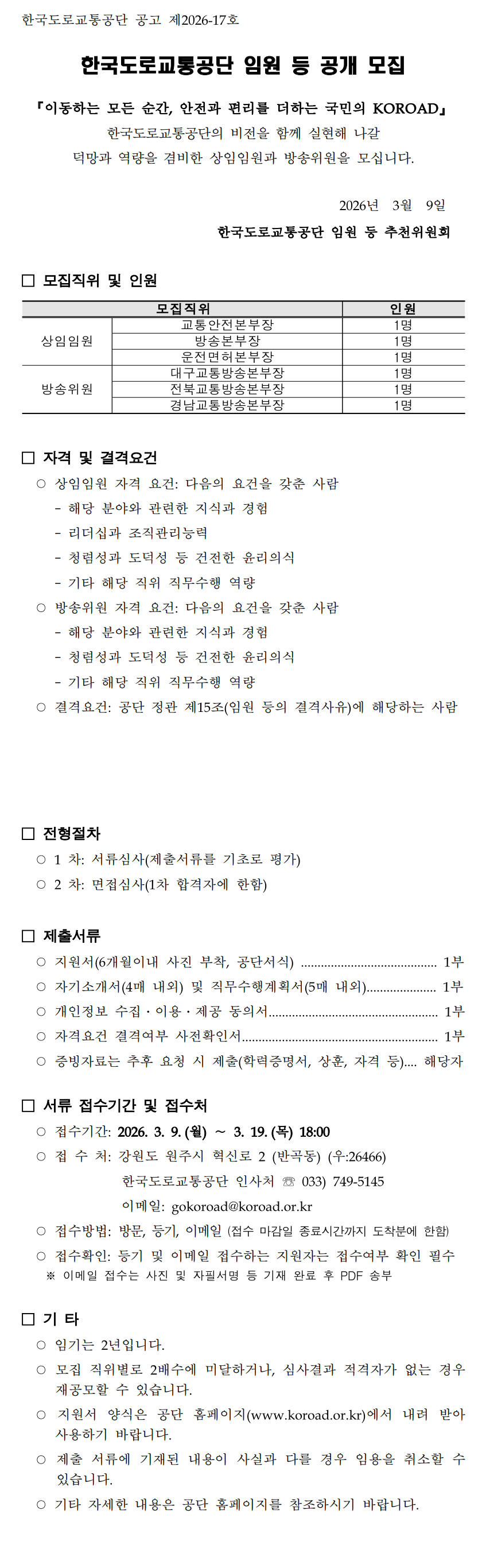 2026³â 3¿ù 9ÀÏÇѱ¹µµ·Î±³Åë°ø´Ü ÀÓ¿ø µî ÃßõÀ§¿øÈ¸¡à ¸ðÁýÁ÷À§ ¹× Àοø