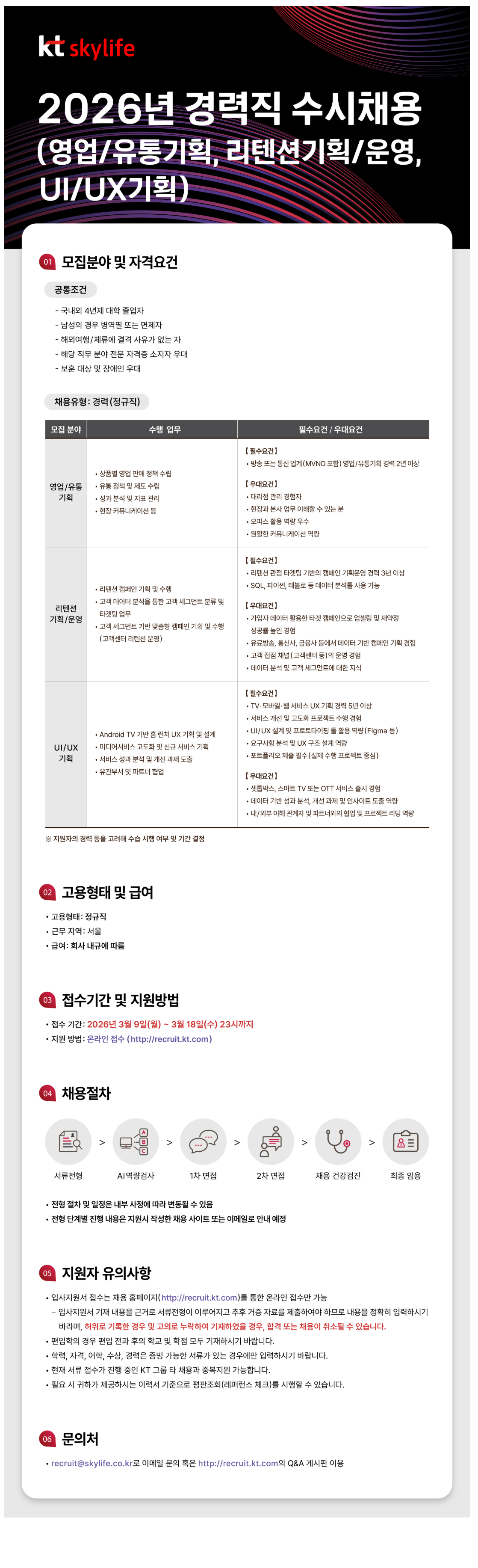 [kt skylife] 2026³â °æ·ÂÁ÷ ¼ö½Ãä¿ë(¿µ¾÷/À¯Åë±âȹ, ¸®ÅټDZâȹ/¿î¿µ, UI/UX±âȹ)