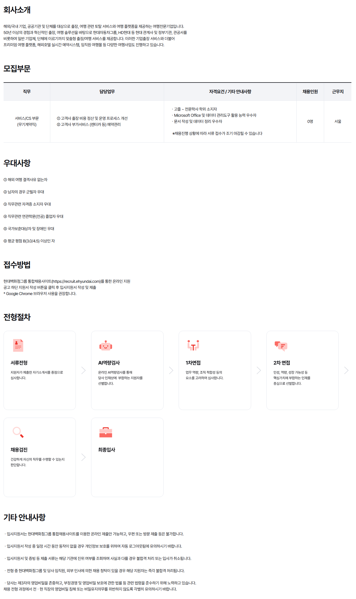 ȸ»ç¼Ò°³ ÇØ¿Ü/±¹³» ±â¾÷, °ø°ø±â°ü ¹× ´Üü¸¦ ´ë»óÀ¸·Î ÃâÀå, ¿©Çà °ü·Ã ÅäÅ» ¼­ºñ½º¿Í ¿©Çà Ç÷§ÆûÀ» Á¦°øÇÏ´Â ¿©ÇàÀü¹®±â¾÷ÀÔ´Ï´Ù. 50³â ÀÌ»óÀÇ °æÇè°ú Çõ½ÅÀûÀÎ ÃâÀå, ¿©Çà ¼Ö·ç¼ÇÀ» ¹ÙÅÁÀ¸·Î Çö´ëÀÚµ¿Â÷±×·ì, HDÇö´ë µî Çö´ë °ü°è»ç ¹× Á¤ºÎ±â°ü, °ü°ø¼­¸¦ ºñ·ÔÇÏ¿© ÀÏ¹Ý ±â¾÷ü, ´Üü¿¡ À̸£±â±îÁö ¸ÂÃãÇü ÃâÀå/¿©Çà ¼­ºñ½º¸¦ Á¦°øÇÕ´Ï´Ù. ÀÌ·¯ÇÑ ±â¾÷ÃâÀå ¼­ºñ½º¿Í ´õºÒ¾î ÇÁ¸®¹Ì¾ö ¿©Çà Ç÷§Æû, ÇØ¿ÜÈ£ÅÚ ½Ç½Ã°£ ¿¹¾à½Ã½ºÅÛ, ÀÓÁ÷¿ø ¿©Çà¸ô µî ´Ù¾çÇÑ ¿©Çà»ç¾÷µµ ÁøÇàÇϰí ÀÖ½À´Ï´Ù. ¸ðÁýºÎ¹® ä¿ë Á÷¹«º° ¸ðÁý ºÎ¹® »ó¼¼ ¾È³» Á÷¹« ´ã´ç¾÷¹« ÀÚ°Ý¿ä°Ç / ±âŸ ¾È³»»çÇ× Ã¤¿ëÀοø ±Ù¹«Áö ¼­ºñ½º/CS ºÎ¹® (¹«±â°è¾àÁ÷) ¨ç °í°´»ç ÃâÀå ºñ¿ë Á¤»ê ¹× ¿î¿µ ÇÁ·Î¼¼½º °³¼± ¨è °í°´»ç ºÎ°¡¼­ºñ½º (·»ÅÍÄ« µî) ¿¹¾à°ü¸® ¤ý°íÁ¹ ~ Àü¹®Çлç ÇÐÀ§ ¼ÒÁöÀÚ ¤ýMicrosoft Office ¹× µ¥ÀÌÅÍ °ü¸®µµ±¸ Ȱ¿ë ´É·Â ¿ì¼öÀÚ ¤ý¹®¼­ ÀÛ¼º ¹× µ¥ÀÌÅÍ Á¤¸® ¿ì¼öÀÚ ¡ØÃ¤¿ëÁøÇà »óȲ¿¡ µû¶ó ¼­·ù Á¢¼ö°¡ Á¶±â ¸¶°¨µÉ ¼ö ÀÖ½À´Ï´Ù 0¸í ¼­¿ï ¿ì´ë»çÇ× ¨ç ÇØ¿Ü ¿©Çà °á°Ý»çÀ¯ ¾ø´ÂÀÚ ¨è ³²ÀÚÀÇ °æ¿ì ±ºÇÊÀÚ ¿ì´ë ¨é Á÷¹«°ü·Ã ÀÚ°ÝÁõ ¼ÒÁöÀÚ ¿ì´ë ¨ê Á÷¹«°ü·Ã ¿¬°üÇй®(Àü°ø) Á¹¾÷ÀÚ ¿ì´ë ¨ë ±¹°¡º¸ÈÆ´ë»óÀÚ ¹× Àå¾ÖÀÎ ¿ì´ë ¨ì Æò±Õ ÆòÁ¡ B(3.0/4.5) ÀÌ»óÀÎ ÀÚ Á¢¼ö¹æ¹ý Çö´ë¹éÈ­Á¡±×·ì ÅëÇÕä¿ë»çÀÌÆ®(https://recruit.ehyundai.com)¸¦ ÅëÇÑ ¿Â¶óÀÎ Áö¿ø °ø°í ÇÏ´Ü Áö¿ø¼­ ÀÛ¼º ¹öưÀ» Ŭ¸¯ ÈÄ ÀÔ»çÁö¿ø¼­ ÀÛ¼º ¹× Á¦Ãâ * Google Chrome ºê¶ó¿ìÀú »ç¿ëÀ» ±ÇÀåÇÕ´Ï´Ù.