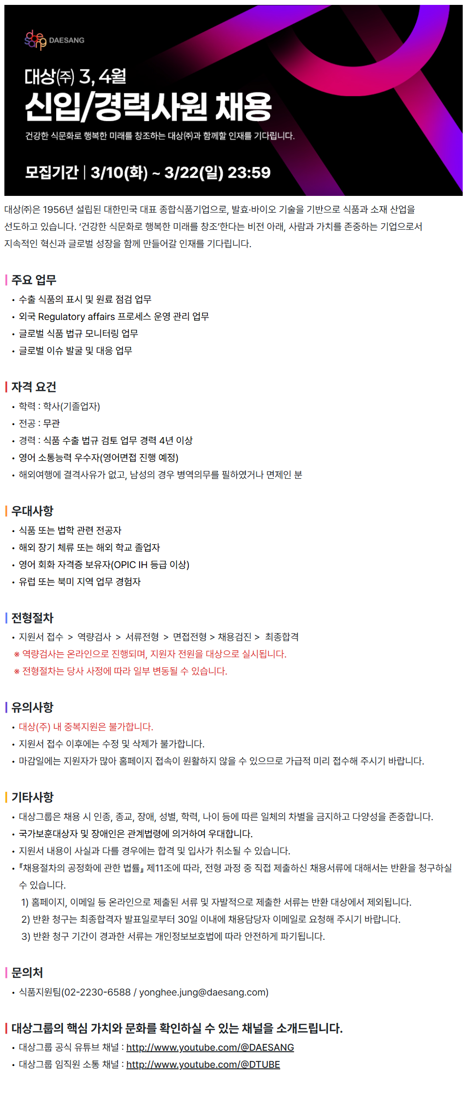 ´ë»ó¢ßÀº 1956³â ​¼³¸³µÈ ​´ëÇѹα¹ ​´ëÇ¥ Á¾ÇÕ½Äǰ±â¾÷À¸·Î, ​¹ßÈ¿¡¤¹ÙÀÌ¿À ±â¼úÀ» ±â¹ÝÀ¸·Î ½Äǰ°ú ​¼ÒÀç ​»ê¾÷À» ¼±µµÇϰí ÀÖ½À´Ï´Ù. ​¡®°Ç°­ÇÑ ½Ä¹®È­·Î ÇູÇÑ ​¹Ì·¡¸¦ âÁ¶¡¯ÇÑ´Ù´Â ​ºñÀü ​¾Æ·¡, »ç¶÷°ú ​°¡Ä¡¸¦ ​Á¸ÁßÇÏ´Â ​±â¾÷À¸·Î¼­ Áö¼ÓÀûÀÎ Çõ½Å°ú ±Û·Î¹ú ​¼ºÀåÀ» ​ÇÔ²² ¸¸µé¾î°¥ ÀÎÀ縦 ​±â´Ù¸³´Ï´Ù. | ​ÁÖ¿ä ​¾÷¹« ¼öÃâ ½ÄǰÀÇ Ç¥½Ã ​¹× ¿ø·á ​Á¡°Ë ​¾÷¹« ¿Ü±¹ Regulatory ​affairs ÇÁ·Î¼¼½º ​¿î¿µ ​°ü¸® ¾÷¹« ±Û·Î¹ú ½Äǰ ​¹ý±Ô ¸ð´ÏÅ͸µ ​¾÷¹« ±Û·Î¹ú À̽´ ¹ß±¼ ¹× ´ëÀÀ ¾÷¹« | ÀÚ°Ý ¿ä°Ç Çз : Çлç(±âÁ¹¾÷ÀÚ) Àü°ø : ¹«°ü °æ·Â : ½Äǰ ¼öÃâ ¹ý±Ô °ËÅä ¾÷¹« °æ·Â 4³â ÀÌ»ó ¿µ¾î ¼ÒÅë´É·Â ¿ì¼öÀÚ(¿µ¾î¸éÁ¢ ÁøÇà ¿¹Á¤) ÇØ¿Ü¿©Çà¿¡ °á°Ý»çÀ¯°¡ ¾ø°í, ³²¼ºÀÇ °æ¿ì º´¿ªÀǹ«¸¦ ÇÊÇÏ¿´°Å³ª ¸éÁ¦ÀÎ ºÐ | ¿ì´ë»çÇ× ½Äǰ ¶Ç´Â ¹ýÇÐ °ü·Ã Àü°øÀÚ ÇØ¿Ü Àå±â ü·ù ¶Ç´Â ÇØ¿Ü Çб³ Á¹¾÷ÀÚ ¿µ¾î ȸȭ ÀÚ°ÝÁõ º¸À¯ÀÚ(OPIC IH µî±Þ ÀÌ»ó) À¯·´ ¶Ç´Â ºÏ¹Ì Áö¿ª ¾÷¹« °æÇèÀÚ | ÀüÇüÀýÂ÷ Áö¿ø¼­ Á¢¼ö £¾ ¿ª·®°Ë»ç £¾ ¼­·ùÀüÇü £¾ ¸éÁ¢ÀüÇü > ä¿ë°ËÁø > ÃÖÁ¾ÇÕ°Ý ¡Ø ¿ª·®°Ë»ç´Â ¿Â¶óÀÎÀ¸·Î ÁøÇàµÇ¸ç, Áö¿øÀÚ Àü¿øÀ» ´ë»óÀ¸·Î ½Ç½ÃµË´Ï´Ù. ¡Ø ÀüÇüÀýÂ÷´Â ´ç»ç »çÁ¤¿¡ µû¶ó ÀϺΠº¯µ¿µÉ ¼ö ÀÖ½À´Ï´Ù. | À¯ÀÇ»çÇ× ´ë»ó(ÁÖ) ³» Áߺ¹Áö¿øÀº ºÒ°¡ÇÕ´Ï´Ù. Áö¿ø¼­ Á¢¼ö ÀÌÈÄ¿¡´Â ¼öÁ¤ ¹× »èÁ¦°¡ ºÒ°¡ÇÕ´Ï´Ù. ¸¶°¨ÀÏ¿¡´Â Áö¿øÀÚ°¡ ¸¹¾Æ ȨÆäÀÌÁö Á¢¼ÓÀÌ ¿øÈ°ÇÏÁö ¾ÊÀ» ¼ö ÀÖÀ¸¹Ç·Î °¡±ÞÀû ¹Ì¸® Á¢¼öÇØ Áֽñ⠹ٶø´Ï´Ù. | ±âŸ»çÇ× ´ë»ó±×·ìÀº ä¿ë ½Ã ÀÎÁ¾, Á¾±³, Àå¾Ö, ¼ºº°, ÇзÂ, ³ªÀÌ µî¿¡ µû¸¥ ÀÏüÀÇ Â÷º°À» ±ÝÁöÇÏ°í ´Ù¾ç¼ºÀ» Á¸ÁßÇÕ´Ï´Ù. ±¹°¡º¸ÈÆ´ë»óÀÚ ¹× Àå¾ÖÀÎÀº °ü°è¹ý·É¿¡ ÀǰÅÇÏ¿© ¿ì´ëÇÕ´Ï´Ù. Áö¿ø¼­ ³»¿ëÀÌ »ç½Ç°ú ´Ù¸¦ °æ¿ì¿¡´Â ÇÕ°Ý ¹× ÀԻ簡 Ãë¼ÒµÉ ¼ö ÀÖ½À´Ï´Ù. ¡ºÃ¤¿ëÀýÂ÷ÀÇ °øÁ¤È­¿¡ °üÇÑ ¹ý·ü¡» Á¦11Á¶¿¡ µû¶ó, ÀüÇü °úÁ¤ Áß Á÷Á¢ Á¦ÃâÇϽŠä¿ë¼­·ù¿¡ ´ëÇØ¼­´Â ¹ÝȯÀ» û±¸ÇÏ½Ç ¼ö ÀÖ½À´Ï´Ù. 1) ȨÆäÀÌÁö, À̸ÞÀÏ µî ¿Â¶óÀÎÀ¸·Î Á¦ÃâµÈ ¼­·ù ¹× ÀÚ¹ßÀûÀ¸·Î Á¦ÃâÇÑ ¼­·ù´Â ¹Ýȯ ´ë»ó¿¡¼­ Á¦¿ÜµË´Ï´Ù. 2) ¹Ýȯ û±¸´Â ÃÖÁ¾ÇÕ°ÝÀÚ ¹ßÇ¥ÀϷκÎÅÍ 30ÀÏ À̳»¿¡ ä¿ë´ã´çÀÚ À̸ÞÀÏ·Î ¿äÃ»ÇØ Áֽñ⠹ٶø´Ï´Ù. 3) ¹Ýȯ û±¸ ±â°£ÀÌ °æ°úÇÑ ¼­·ù´Â °³ÀÎÁ¤º¸º¸È£¹ý¿¡ µû¶ó ¾ÈÀüÇÏ°Ô ÆÄ±âµË´Ï´Ù. | ¹®ÀÇó ½ÄǰÁö¿øÆÀ(***-****-**** / ******@*******.***) | ´ë»ó±×·ìÀÇ ÇÙ½É °¡Ä¡¿Í ¹®È­¸¦ È®ÀÎÇÏ½Ç ¼ö Àִ ä³ÎÀ» ¼Ò°³µå¸³´Ï´Ù. ´ë»ó±×·ì °ø½Ä À¯Æ©ºê ä³Î : http://www.youtube.com/@DAESANG ´ë»ó±×·ì ÀÓÁ÷¿ø ¼ÒÅë ä³Î : http://www.youtube.com/@DTUBE