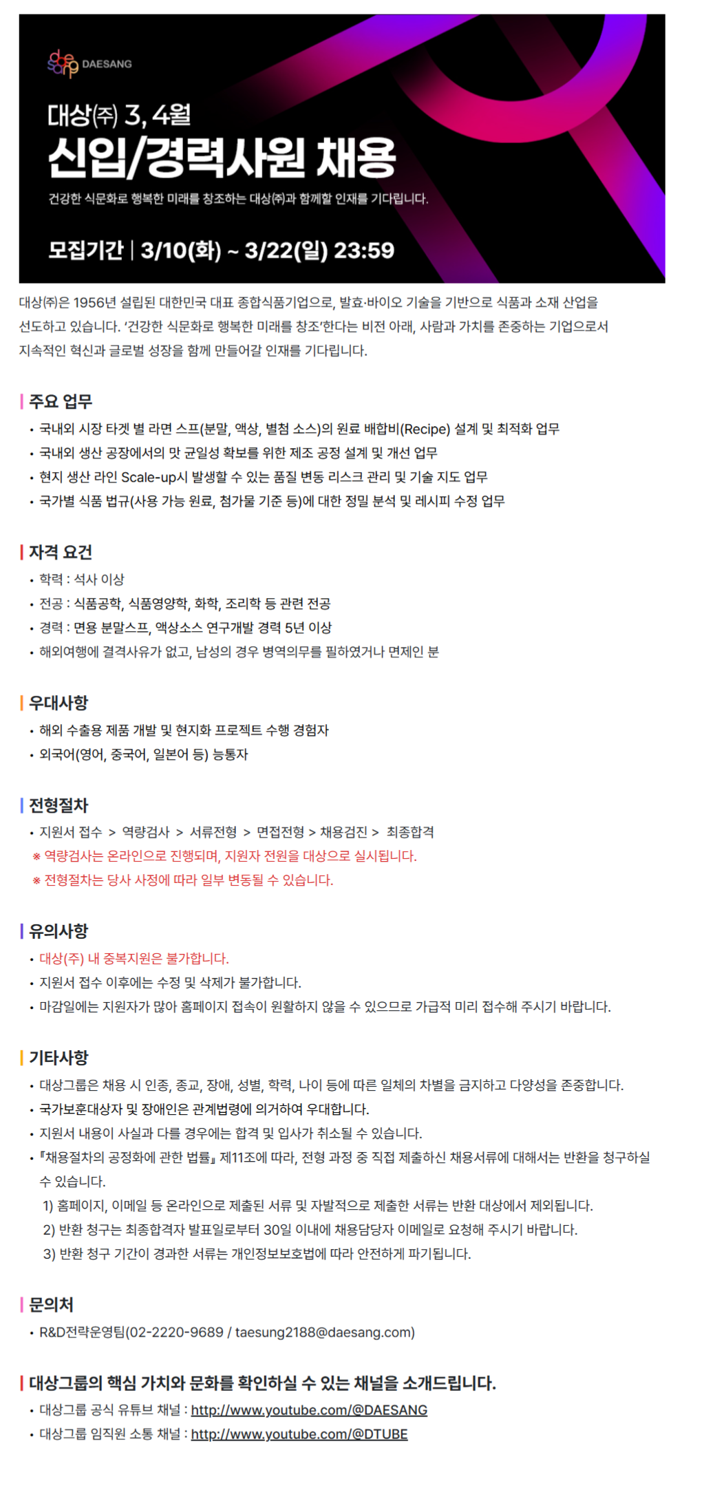 [´ë»ó(ÁÖ)] R&DºÎ¹® ½Äǰ¿¬±¸(¶ó¸é½ºÇÁ) °æ·Â»ç¿ø ä¿ë