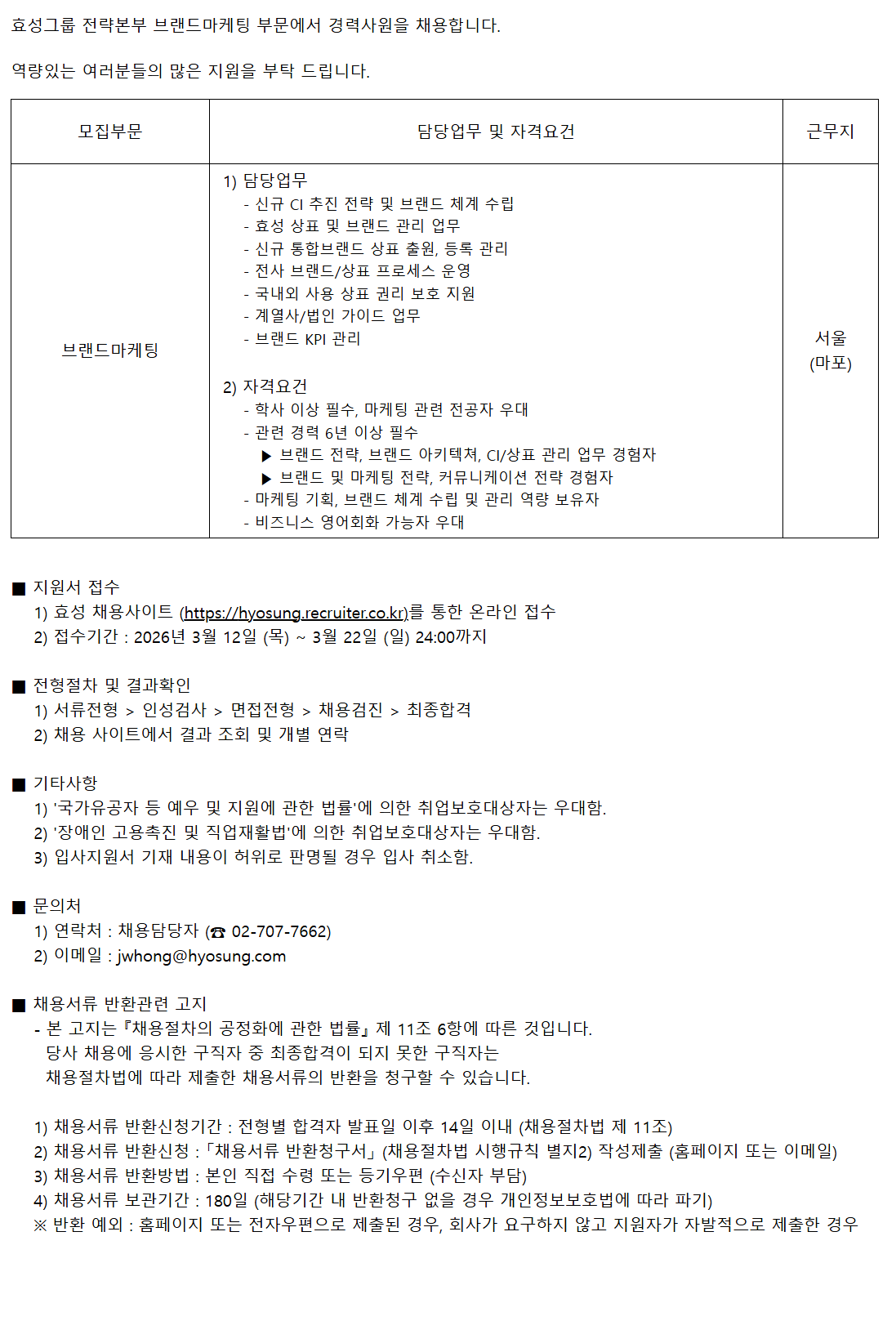 È¿¼º±×·ì Àü·«º»ºÎ ºê·£µå¸¶ÄÉÆÃ ºÎ¹®¿¡¼ °æ·Â»ç¿øÀ» ä¿ëÇÕ´Ï´Ù.