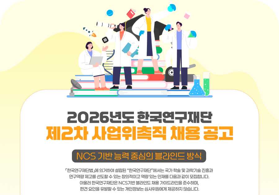 ¡¸Çѱ¹¿¬±¸Àç´Ü¹ý¡¹¿¡ ÀǰÅÇÏ¿© ¼³¸³µÈ ¡°Çѱ¹¿¬±¸Àç´Ü¡±¿¡¼­´Â ±¹°¡ Çмú ¹× °úÇбâ¼ú ÁøÈï°ú ¿¬±¸¿ª·® Á¦°í¸¦ ¼±µµÇÒ ¼ö Àִ âÀÇÀûÀÌ°í ¿ª·® ÀÖ´Â ÀÎÀ縦 ´ÙÀ½°ú °°ÀÌ ¸ðÁýÇÕ´Ï´Ù. ¾Æ¿ï·¯ Çѱ¹¿¬±¸Àç´ÜÀº NCS±â¹Ý ºí¶óÀεå ä¿ë °¡À̵å¶óÀÎÀ» ÁؼöÇϸç, Æí°ß ¿äÀÎÀ» À¯¹ßÇÒ ¼ö ÀÖ´Â °³ÀÎÁ¤º¸´Â ½É»çÀ§¿ø¿¡°Ô Á¦°øÇÏÁö ¾Ê½À´Ï´Ù.