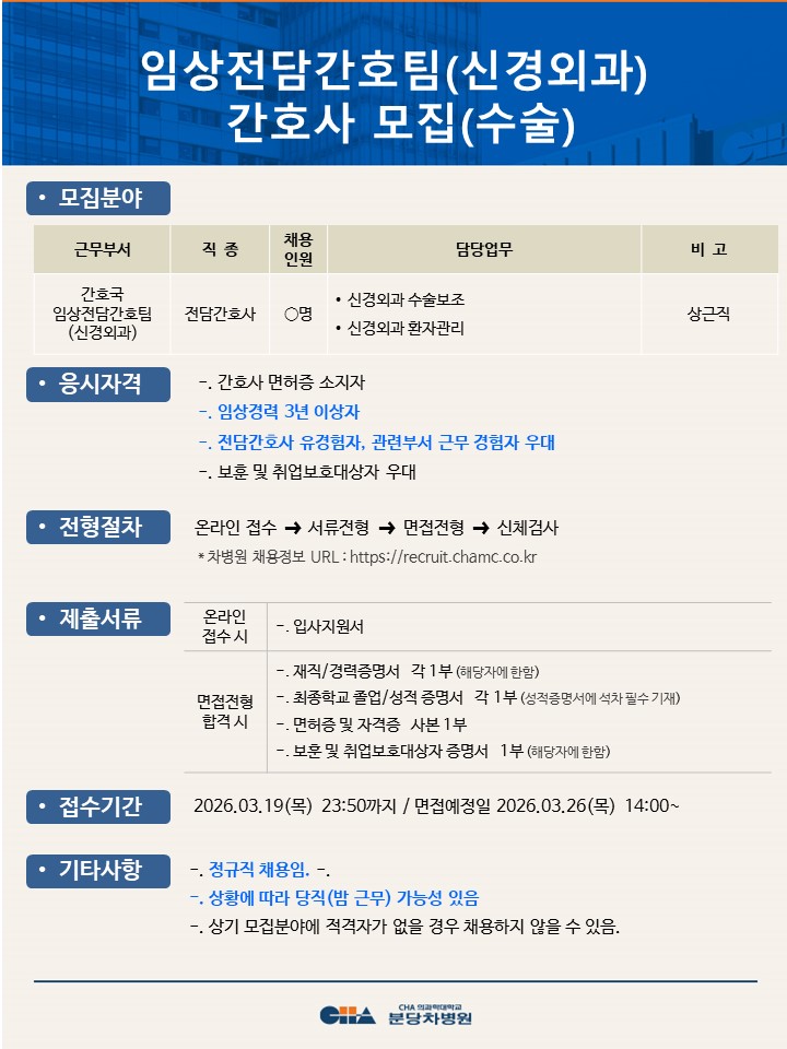 [ºÐ´çÂ÷º´¿ø] ÀÓ»óÀü´ã°£È£ÆÀ(ºñ´¢ÀÇÇаú) °£È£»ç ¸ðÁý(¿Ü·¡&¼ö¼ú½Ç)