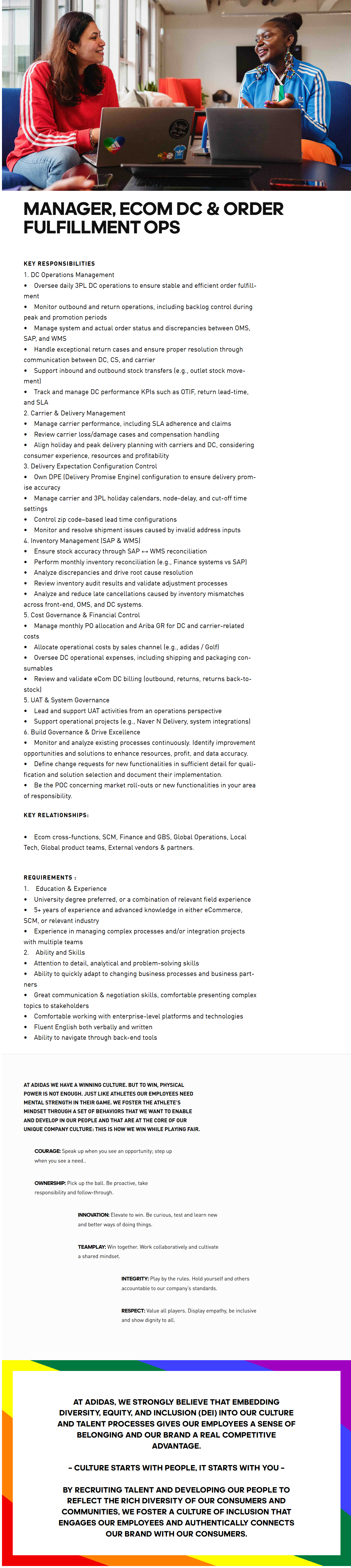 • Oversee daily 3PL DC operations to ensure stable and efficient order fulfillment