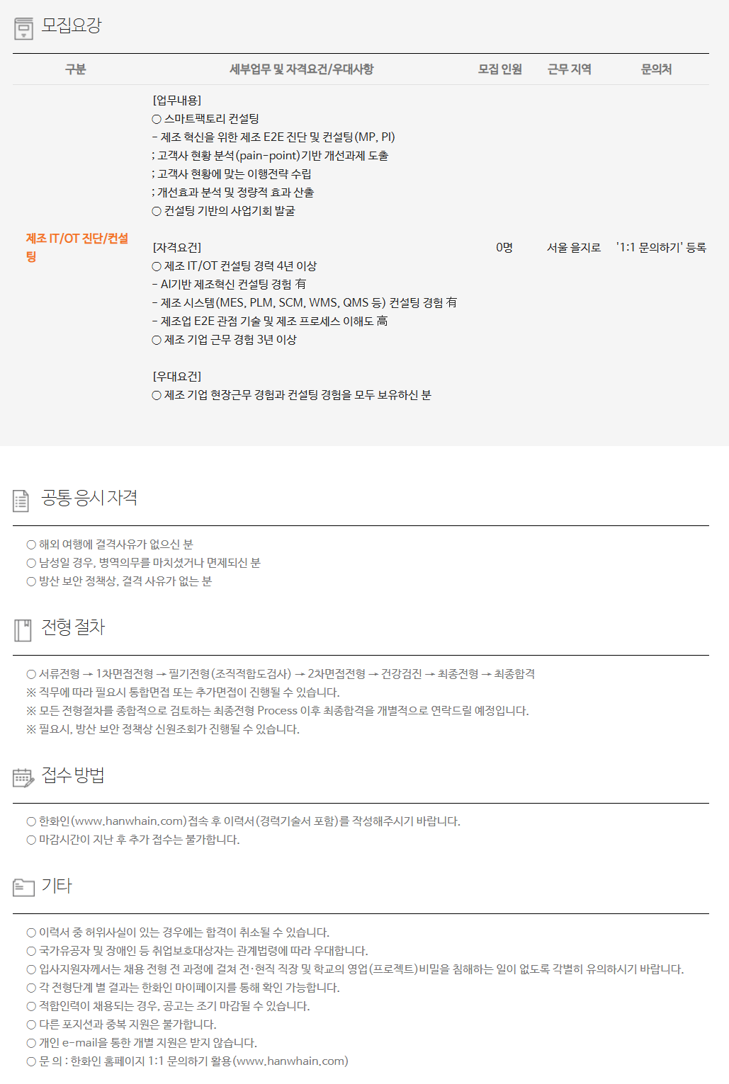 ±¸ºÐ ¼¼ºÎ¾÷¹« ¹× ÀÚ°Ý¿ä°Ç/¿ì´ë»çÇ× ¸ðÁý Àοø ±Ù¹« Áö¿ª ¹®ÀÇó Á¦Á¶ IT/OT Áø´Ü/ÄÁ¼³ÆÃ [¾÷¹«³»¿ë] ¡Û ½º¸¶Æ®ÆÑÅ丮 ÄÁ¼³ÆÃ - Á¦Á¶ Çõ½ÅÀ» À§ÇÑ Á¦Á¶ E2E Áø´Ü ¹× ÄÁ¼³ÆÃ(MP, PI) ; °í°´»ç ÇöȲ ºÐ¼®(pain-point)±â¹Ý °³¼±°úÁ¦ µµÃâ ; °í°´»ç ÇöȲ¿¡ ¸Â´Â ÀÌÇàÀü·« ¼ö¸³ ; °³¼±È¿°ú ºÐ¼® ¹× Á¤·®Àû È¿°ú »êÃâ ¡Û ÄÁ¼³ÆÃ ±â¹ÝÀÇ »ç¾÷±âȸ ¹ß±¼ [ÀÚ°Ý¿ä°Ç] ¡Û Á¦Á¶ IT/OT ÄÁ¼³ÆÃ °æ·Â 4³â ÀÌ»ó - AI±â¹Ý Á¦Á¶Çõ½Å ÄÁ¼³ÆÃ °æÇè êó - Á¦Á¶ ½Ã½ºÅÛ(MES, PLM, SCM, WMS, QMS µî) ÄÁ¼³ÆÃ °æÇè êó - Á¦Á¶¾÷ E2E °üÁ¡ ±â¼ú ¹× Á¦Á¶ ÇÁ·Î¼¼½º ÀÌÇØµµ ÍÔ ¡Û Á¦Á¶ ±â¾÷ ±Ù¹« °æÇè 3³â ÀÌ»ó [¿ì´ë¿ä°Ç] ¡Û Á¦Á¶ ±â¾÷ ÇöÀå±Ù¹« °æÇè°ú ÄÁ¼³ÆÃ °æÇèÀ» ¸ðµÎ º¸À¯ÇϽŠºÐ 0¸í ¼­¿ï À»Áö·Î '1:1 ¹®ÀÇÇϱâ' µî·Ï