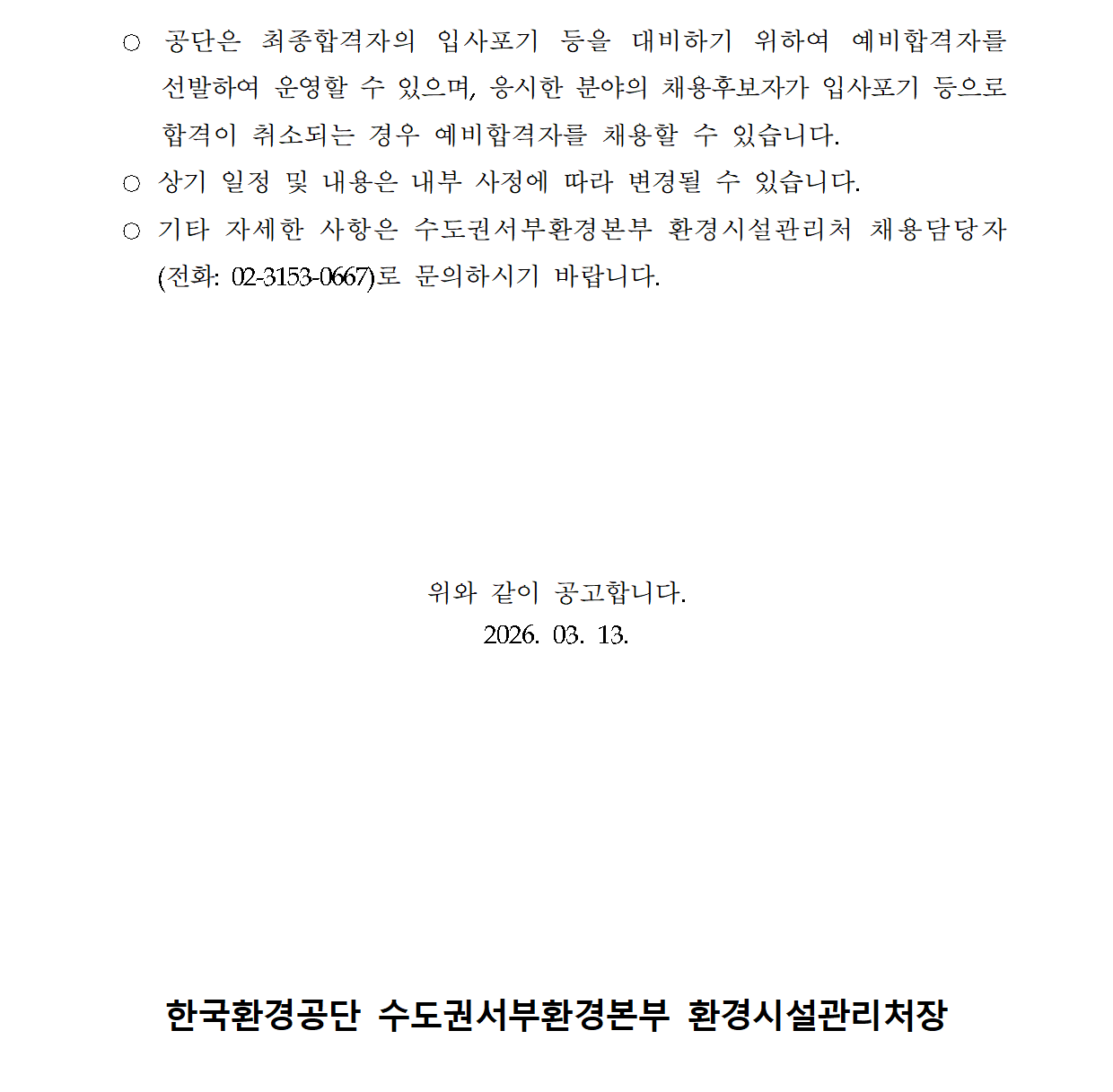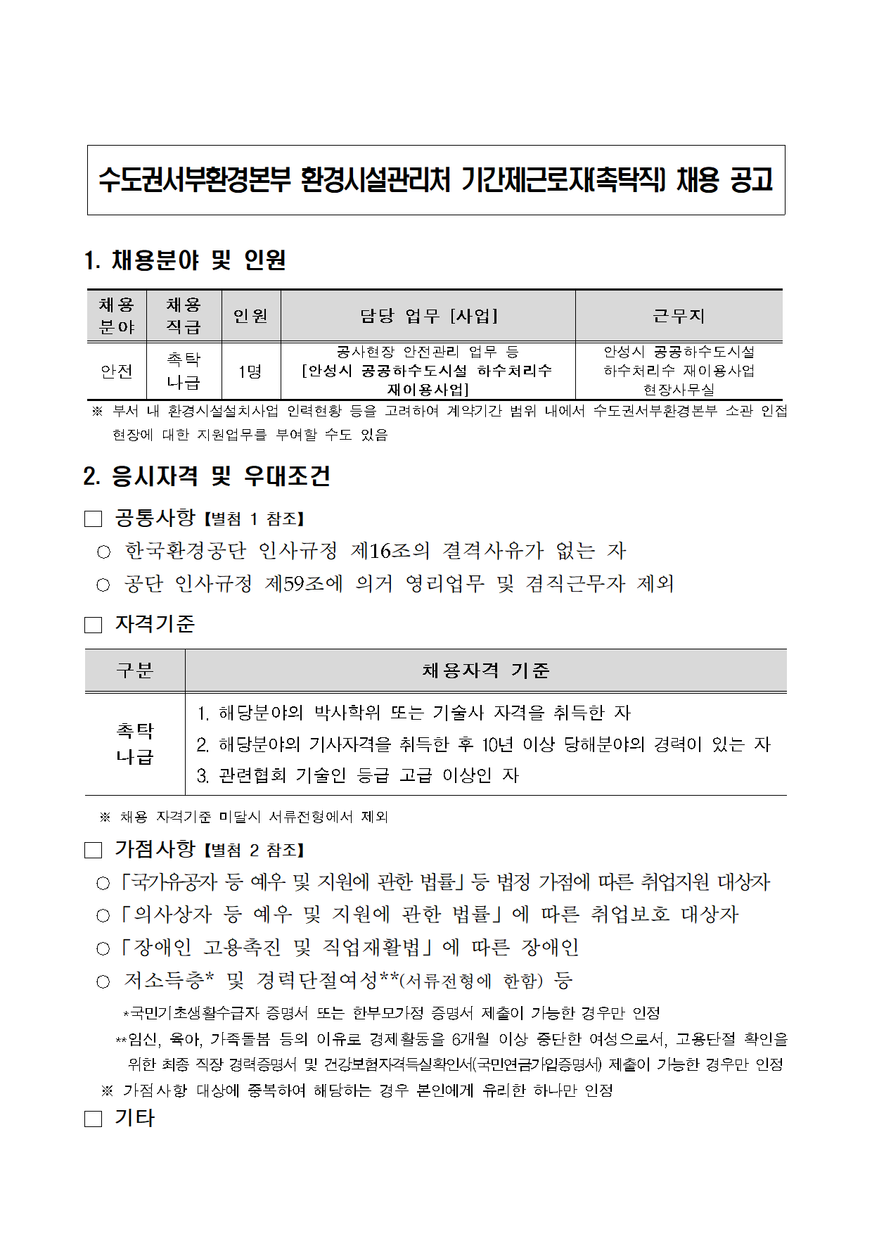 Çѱ¹È¯°æ°ø´Ü ¼öµµ±Ç¼ºÎȯ°æº»ºÎ ȯ°æ½Ã¼³°ü¸®Ã³ ±â°£Á¦±Ù·ÎÀÚ(ÃËŹÁ÷) ä¿ë °ø°í