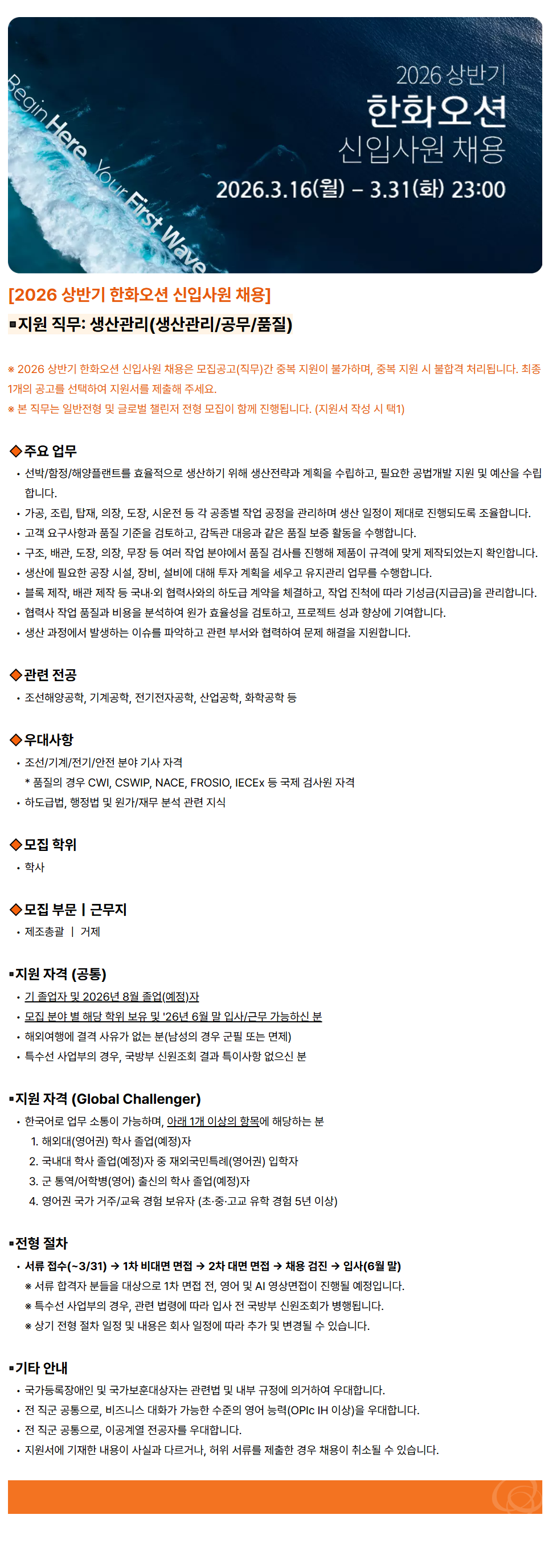 [2026 ​»ó¹Ý±â ​ÇÑÈ­¿À¼Ç ​½ÅÀÔ»ç¿ø ä¿ë] ​ ◾Áö¿ø Á÷¹«: »ý»ê°ü¸®(»ý»ê°ü¸®/°ø¹«/ǰÁú) ¡Ø 2026 ​»ó¹Ý±â ​ÇÑÈ­¿À¼Ç ½ÅÀÔ»ç¿ø ​ä¿ëÀº ¸ðÁý°ø°í(Á÷¹«)°£ Áߺ¹ ​Áö¿øÀÌ ºÒ°¡Çϸç, ​Áߺ¹ ​Áö¿ø ½Ã ​ºÒÇÕ°Ý ​󸮵˴ϴÙ. ​ÃÖÁ¾ 1°³ÀÇ °ø°í¸¦ ​¼±ÅÃÇÏ¿© ​Áö¿ø¼­¸¦ Á¦ÃâÇØ ÁÖ¼¼¿ä. ¡Ø ​º» ​Á÷¹«´Â ​ÀϹÝÀüÇü ¹× ±Û·Î¹ú ​縰Àú ÀüÇü ​¸ðÁýÀÌ ​ÇÔ²² ÁøÇàµË´Ï´Ù. ​(Áö¿ø¼­ ÀÛ¼º ​½Ã ​ÅÃ1) 🔸ÁÖ¿ä ¾÷¹« ¼±¹Ú/ÇÔÁ¤/ÇØ¾çÇ÷£Æ®¸¦ È¿À²ÀûÀ¸·Î ​»ý»êÇϱâ À§ÇØ ​»ý»êÀü·«°ú °èȹÀ» ¼ö¸³Çϰí, ÇÊ¿äÇÑ °ø¹ý°³¹ß Áö¿ø ¹× ¿¹»êÀ» ¼ö¸³ÇÕ´Ï´Ù. °¡°ø, Á¶¸³, žÀç, ÀÇÀå, µµÀå, ½Ã¿îÀü µî °¢ °øÁ¾º° ÀÛ¾÷ °øÁ¤À» °ü¸®ÇÏ¸ç »ý»ê ÀÏÁ¤ÀÌ Á¦´ë·Î ÁøÇàµÇµµ·Ï Á¶À²ÇÕ´Ï´Ù. °í°´ ¿ä±¸»çÇ×°ú ǰÁú ±âÁØÀ» °ËÅäÇϰí, °¨µ¶°ü ´ëÀÀ°ú °°Àº ǰÁú º¸Áõ Ȱµ¿À» ¼öÇàÇÕ´Ï´Ù. ±¸Á¶, ¹è°ü, µµÀå, ÀÇÀå, ¹«Àå µî ¿©·¯ ÀÛ¾÷ ºÐ¾ß¿¡¼­ ǰÁú °Ë»ç¸¦ ÁøÇàÇØ Á¦Ç°ÀÌ ±Ô°Ý¿¡ ¸Â°Ô Á¦À۵Ǿú´ÂÁö È®ÀÎÇÕ´Ï´Ù. »ý»ê¿¡ ÇÊ¿äÇÑ °øÀå ½Ã¼³, Àåºñ, ¼³ºñ¿¡ ´ëÇØ ÅõÀÚ °èȹÀ» ¼¼¿ì°í À¯Áö°ü¸® ¾÷¹«¸¦ ¼öÇàÇÕ´Ï´Ù. ºí·Ï Á¦ÀÛ, ¹è°ü Á¦ÀÛ µî ±¹³»¡¤¿Ü Çù·Â»ç¿ÍÀÇ Çϵµ±Þ °è¾àÀ» ü°áÇϰí, ÀÛ¾÷ ÁøÃ´¿¡ µû¶ó ±â¼º±Ý(Áö±Þ±Ý)À» °ü¸®ÇÕ´Ï´Ù. Çù·Â»ç ÀÛ¾÷ ǰÁú°ú ºñ¿ëÀ» ºÐ¼®ÇÏ¿© ¿ø°¡ È¿À²¼ºÀ» °ËÅäÇϰí, ÇÁ·ÎÁ§Æ® ¼º°ú Çâ»ó¿¡ ±â¿©ÇÕ´Ï´Ù. »ý»ê °úÁ¤¿¡¼­ ¹ß»ýÇÏ´Â À̽´¸¦ ÆÄ¾ÇÇÏ°í °ü·Ã ºÎ¼­¿Í Çù·ÂÇÏ¿© ¹®Á¦ ÇØ°áÀ» Áö¿øÇÕ´Ï´Ù. 🔸°ü·Ã Àü°ø Á¶¼±ÇØ¾ç°øÇÐ, ±â°è°øÇÐ, Àü±âÀüÀÚ°øÇÐ, »ê¾÷°øÇÐ, È­ÇаøÇÐ µî 🔸¿ì´ë»çÇ× Á¶¼±/±â°è/Àü±â/¾ÈÀü ºÐ¾ß ±â»ç ÀÚ°Ý * ǰÁúÀÇ °æ¿ì CWI, CSWIP, NACE, FROSIO, IECEx µî ±¹Á¦ °Ë»ç¿ø ÀÚ°Ý Çϵµ±Þ¹ý, ÇàÁ¤¹ý ¹× ¿ø°¡/À繫 ºÐ¼® °ü·Ã Áö½Ä 🔸¸ðÁý ÇÐÀ§ Çлç 🔸¸ðÁý ºÎ¹®£ü±Ù¹«Áö Á¦Á¶ÃѰý £ü °ÅÁ¦ ▪️Áö¿ø ÀÚ°Ý (°øÅë) ±â Á¹¾÷ÀÚ ¹× 2026³â 8¿ù Á¹¾÷(¿¹Á¤)ÀÚ ¸ðÁý ºÐ¾ß º° ÇØ´ç ÇÐÀ§ º¸À¯ ¹× '26³â 6¿ù ¸» ÀÔ»ç/±Ù¹« °¡´ÉÇϽŠºÐ ÇØ¿Ü¿©Çà¿¡ °á°Ý »çÀ¯°¡ ¾ø´Â ºÐ(³²¼ºÀÇ °æ¿ì ±ºÇÊ ¶Ç´Â ¸éÁ¦) Ư¼ö¼± »ç¾÷ºÎÀÇ °æ¿ì, ±¹¹æºÎ ½Å¿øÁ¶È¸ °á°ú ƯÀÌ»çÇ× ¾øÀ¸½Å ºÐ ▪️Áö¿ø ÀÚ°Ý (Global Challenger) Çѱ¹¾î·Î ¾÷¹« ¼ÒÅëÀÌ °¡´ÉÇϸç, ¾Æ·¡ 1°³ ÀÌ»óÀÇ Ç׸ñ¿¡ ÇØ´çÇÏ´Â ºÐ ÇØ¿Ü´ë(¿µ¾î±Ç) Çлç Á¹¾÷(¿¹Á¤)ÀÚ ±¹³»´ë Çлç Á¹¾÷(¿¹Á¤)ÀÚ Áß Àç¿Ü±¹¹ÎƯ·Ê(¿µ¾î±Ç) ÀÔÇÐÀÚ ±º Å뿪/¾îÇк´(¿µ¾î) Ãâ½ÅÀÇ Çлç Á¹¾÷(¿¹Á¤)ÀÚ ¿µ¾î±Ç ±¹°¡ °ÅÁÖ/±³À° °æÇè º¸À¯ÀÚ (ÃÊ¡¤Áß¡¤°í±³ À¯ÇÐ °æÇè 5³â ÀÌ»ó) ▪️ÀüÇü ÀýÂ÷ ¼­·ù Á¢¼ö(~3/31) ¡æ 1Â÷ ºñ´ë¸é ¸éÁ¢ ¡æ 2Â÷ ´ë¸é ¸éÁ¢ ¡æ ä¿ë °ËÁø ¡æ ÀÔ»ç(6¿ù ¸») ¡Ø ¼­·ù ÇÕ°ÝÀÚ ºÐµéÀ» ´ë»óÀ¸·Î 1Â÷ ¸éÁ¢ Àü, ¿µ¾î ¹× AI ¿µ»ó¸éÁ¢ÀÌ ÁøÇàµÉ ¿¹Á¤ÀÔ´Ï´Ù. ¡Ø Ư¼ö¼± »ç¾÷ºÎÀÇ °æ¿ì, °ü·Ã ¹ý·É¿¡ µû¶ó ÀÔ»ç Àü ±¹¹æºÎ ½Å¿øÁ¶È¸°¡ º´ÇàµË´Ï´Ù. ¡Ø »ó±â ÀüÇü ÀýÂ÷ ÀÏÁ¤ ¹× ³»¿ëÀº ȸ»ç ÀÏÁ¤¿¡ µû¶ó Ãß°¡ ¹× º¯°æµÉ ¼ö ÀÖ½À´Ï´Ù. ▪️±âŸ ¾È³» ±¹°¡µî·ÏÀå¾ÖÀÎ ¹× ±¹°¡º¸ÈÆ´ë»óÀÚ´Â °ü·Ã¹ý ¹× ³»ºÎ ±ÔÁ¤¿¡ ÀǰÅÇÏ¿© ¿ì´ëÇÕ´Ï´Ù. Àü Á÷±º °øÅëÀ¸·Î, ºñÁî´Ï½º ´ëÈ­°¡ °¡´ÉÇÑ ¼öÁØÀÇ ¿µ¾î ´É·Â(OPIc IH ÀÌ»ó)À» ¿ì´ëÇÕ´Ï´Ù. Àü Á÷±º °øÅëÀ¸·Î, À̰ø°è¿­ Àü°øÀÚ¸¦ ¿ì´ëÇÕ´Ï´Ù. Áö¿ø¼­¿¡ ±âÀçÇÑ ³»¿ëÀÌ »ç½Ç°ú ´Ù¸£°Å³ª, ÇãÀ§ ¼­·ù¸¦ Á¦ÃâÇÑ °æ¿ì ä¿ëÀÌ Ãë¼ÒµÉ ¼ö ÀÖ½À´Ï´Ù.