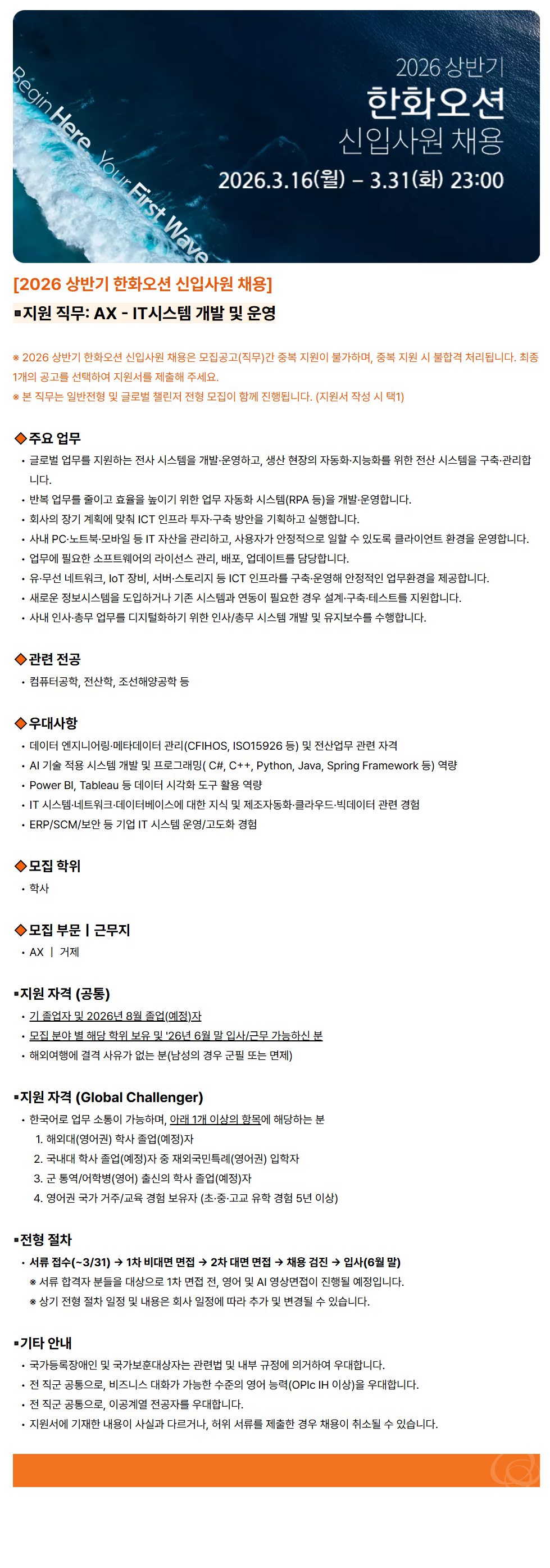 [2026 ​»ó¹Ý±â ​ÇÑÈ­¿À¼Ç ​½ÅÀÔ»ç¿ø ä¿ë] ​ ◾Áö¿ø Á÷¹«: AX - ​IT½Ã½ºÅÛ ​°³¹ß ¹× ​¿î¿µ ¡Ø 2026 »ó¹Ý±â ​ÇÑÈ­¿À¼Ç ½ÅÀÔ»ç¿ø ​ä¿ëÀº ​¸ðÁý°ø°í(Á÷¹«)°£ Áߺ¹ ​Áö¿øÀÌ ​ºÒ°¡Çϸç, ​Áߺ¹ Áö¿ø ½Ã ​ºÒÇÕ°Ý ​󸮵˴ϴÙ. ÃÖÁ¾ 1°³ÀÇ ​°ø°í¸¦ ​¼±ÅÃÇÏ¿© ​Áö¿ø¼­¸¦ Á¦ÃâÇØ ÁÖ¼¼¿ä. ¡Ø ​º» Á÷¹«´Â ​ÀϹÝÀüÇü ​¹× ±Û·Î¹ú ​縰Àú ÀüÇü ​¸ðÁýÀÌ ​ÇÔ²² ÁøÇàµË´Ï´Ù. (Áö¿ø¼­ ​ÀÛ¼º ½Ã ​ÅÃ1) 🔸ÁÖ¿ä ¾÷¹« ±Û·Î¹ú ¾÷¹«¸¦ Áö¿øÇÏ´Â Àü»ç ½Ã½ºÅÛÀ» °³¹ß¡¤¿î¿µÇϰí, »ý»ê ÇöÀåÀÇ ÀÚµ¿È­¡¤Áö´ÉÈ­¸¦ À§ÇÑ Àü»ê ½Ã½ºÅÛÀ» ±¸Ãࡤ°ü¸®ÇÕ´Ï´Ù. ¹Ýº¹ ¾÷¹«¸¦ ÁÙÀ̰í È¿À²À» ³ôÀ̱â À§ÇÑ ¾÷¹« ÀÚµ¿È­ ½Ã½ºÅÛ(RPA µî)À» °³¹ß¡¤¿î¿µÇÕ´Ï´Ù. ȸ»çÀÇ Àå±â °èȹ¿¡ ¸ÂÃç ICT ÀÎÇÁ¶ó ÅõÀÚ¡¤±¸Ãà ¹æ¾ÈÀ» ±âȹÇÏ°í ½ÇÇàÇÕ´Ï´Ù. »ç³» PC¡¤³ëÆ®ºÏ¡¤¸ð¹ÙÀÏ µî IT ÀÚ»êÀ» °ü¸®Çϰí, »ç¿ëÀÚ°¡ ¾ÈÁ¤ÀûÀ¸·Î ÀÏÇÒ ¼ö ÀÖµµ·Ï Ŭ¶óÀÌ¾ðÆ® È¯°æÀ» ¿î¿µÇÕ´Ï´Ù. ¾÷¹«¿¡ ÇÊ¿äÇÑ ¼ÒÇÁÆ®¿þ¾îÀÇ ¶óÀ̼±½º °ü¸®, ¹èÆ÷, ¾÷µ¥ÀÌÆ®¸¦ ´ã´çÇÕ´Ï´Ù. À¯¡¤¹«¼± ³×Æ®¿öÅ©, IoT Àåºñ, ¼­¹ö¡¤½ºÅ丮Áö µî ICT ÀÎÇÁ¶ó¸¦ ±¸Ãࡤ¿î¿µÇØ ¾ÈÁ¤ÀûÀÎ ¾÷¹«È¯°æÀ» Á¦°øÇÕ´Ï´Ù. »õ·Î¿î Á¤º¸½Ã½ºÅÛÀ» µµÀÔÇϰųª ±âÁ¸ ½Ã½ºÅÛ°ú ¿¬µ¿ÀÌ ÇÊ¿äÇÑ °æ¿ì ¼³°è¡¤±¸ÃࡤÅ×½ºÆ®¸¦ Áö¿øÇÕ´Ï´Ù. »ç³» Àλ硤Ãѹ« ¾÷¹«¸¦ µðÁöÅÐÈ­Çϱâ À§ÇÑ Àλç/Ãѹ« ½Ã½ºÅÛ °³¹ß ¹× À¯Áöº¸¼ö¸¦ ¼öÇàÇÕ´Ï´Ù. 🔸°ü·Ã Àü°ø ÄÄÇ»ÅͰøÇÐ, Àü»êÇÐ, Á¶¼±ÇØ¾ç°øÇÐ µî 🔸¿ì´ë»çÇ× µ¥ÀÌÅÍ ¿£Áö´Ï¾î¸µ¡¤¸ÞŸµ¥ÀÌÅÍ °ü¸®(CFIHOS, ISO15926 µî) ¹× Àü»ê¾÷¹« °ü·Ã ÀÚ°Ý AI ±â¼ú Àû¿ë ½Ã½ºÅÛ °³¹ß ¹× ÇÁ·Î±×·¡¹Ö( C#, C++, Python, Java, Spring Framework µî) ¿ª·® Power BI, Tableau µî µ¥ÀÌÅÍ ½Ã°¢È­ µµ±¸ Ȱ¿ë ¿ª·® IT ½Ã½ºÅÛ¡¤³×Æ®¿öÅ©¡¤µ¥ÀÌÅͺ£À̽º¿¡ ´ëÇÑ Áö½Ä ¹× Á¦Á¶ÀÚµ¿È­¡¤Å¬¶ó¿ìµå¡¤ºòµ¥ÀÌÅÍ °ü·Ã °æÇè ERP/SCM/º¸¾È µî ±â¾÷ IT ½Ã½ºÅÛ ¿î¿µ/°íµµÈ­ °æÇè 🔸¸ðÁý ÇÐÀ§ Çлç 🔸¸ðÁý ºÎ¹®£ü±Ù¹«Áö AX £ü °ÅÁ¦ ▪️Áö¿ø ÀÚ°Ý (°øÅë) ±â Á¹¾÷ÀÚ ¹× 2026³â 8¿ù Á¹¾÷(¿¹Á¤)ÀÚ ¸ðÁý ºÐ¾ß º° ÇØ´ç ÇÐÀ§ º¸À¯ ¹× '26³â 6¿ù ¸» ÀÔ»ç/±Ù¹« °¡´ÉÇϽŠºÐ ÇØ¿Ü¿©Çà¿¡ °á°Ý »çÀ¯°¡ ¾ø´Â ºÐ(³²¼ºÀÇ °æ¿ì ±ºÇÊ ¶Ç´Â ¸éÁ¦) ▪️Áö¿ø ÀÚ°Ý (Global Challenger) Çѱ¹¾î·Î ¾÷¹« ¼ÒÅëÀÌ °¡´ÉÇϸç, ¾Æ·¡ 1°³ ÀÌ»óÀÇ Ç׸ñ¿¡ ÇØ´çÇÏ´Â ºÐ ÇØ¿Ü´ë(¿µ¾î±Ç) Çлç Á¹¾÷(¿¹Á¤)ÀÚ ±¹³»´ë Çлç Á¹¾÷(¿¹Á¤)ÀÚ Áß Àç¿Ü±¹¹ÎƯ·Ê(¿µ¾î±Ç) ÀÔÇÐÀÚ ±º Å뿪/¾îÇк´(¿µ¾î) Ãâ½ÅÀÇ Çлç Á¹¾÷(¿¹Á¤)ÀÚ ¿µ¾î±Ç ±¹°¡ °ÅÁÖ/±³À° °æÇè º¸À¯ÀÚ (ÃÊ¡¤Áß¡¤°í±³ À¯ÇÐ °æÇè 5³â ÀÌ»ó) ▪️ÀüÇü ÀýÂ÷ ¼­·ù Á¢¼ö(~3/31) ¡æ 1Â÷ ºñ´ë¸é ¸éÁ¢ ¡æ 2Â÷ ´ë¸é ¸éÁ¢ ¡æ ä¿ë °ËÁø ¡æ ÀÔ»ç(6¿ù ¸») ¡Ø ¼­·ù ÇÕ°ÝÀÚ ºÐµéÀ» ´ë»óÀ¸·Î 1Â÷ ¸éÁ¢ Àü, ¿µ¾î ¹× AI ¿µ»ó¸éÁ¢ÀÌ ÁøÇàµÉ ¿¹Á¤ÀÔ´Ï´Ù. ¡Ø »ó±â ÀüÇü ÀýÂ÷ ÀÏÁ¤ ¹× ³»¿ëÀº ȸ»ç ÀÏÁ¤¿¡ µû¶ó Ãß°¡ ¹× º¯°æµÉ ¼ö ÀÖ½À´Ï´Ù. ▪️±âŸ ¾È³» ±¹°¡µî·ÏÀå¾ÖÀÎ ¹× ±¹°¡º¸ÈÆ´ë»óÀÚ´Â °ü·Ã¹ý ¹× ³»ºÎ ±ÔÁ¤¿¡ ÀǰÅÇÏ¿© ¿ì´ëÇÕ´Ï´Ù. Àü Á÷±º °øÅëÀ¸·Î, ºñÁî´Ï½º ´ëÈ­°¡ °¡´ÉÇÑ ¼öÁØÀÇ ¿µ¾î ´É·Â(OPIc IH ÀÌ»ó)À» ¿ì´ëÇÕ´Ï´Ù. Àü Á÷±º °øÅëÀ¸·Î, À̰ø°è¿­ Àü°øÀÚ¸¦ ¿ì´ëÇÕ´Ï´Ù. Áö¿ø¼­¿¡ ±âÀçÇÑ ³»¿ëÀÌ »ç½Ç°ú ´Ù¸£°Å³ª, ÇãÀ§ ¼­·ù¸¦ Á¦ÃâÇÑ °æ¿ì ä¿ëÀÌ Ãë¼ÒµÉ ¼ö ÀÖ½À´Ï´Ù.