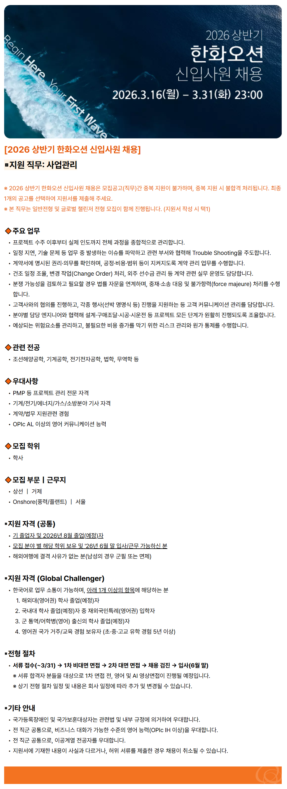 ¡Ø 2026 »ó¹Ý±â ÇÑÈ¿À¼Ç ½ÅÀÔ»ç¿ø ä¿ëÀº ¸ðÁý°ø°í(Á÷¹«)°£ Áߺ¹ Áö¿øÀÌ ºÒ°¡Çϸç, Áߺ¹ Áö¿ø ½Ã ºÒÇÕ°Ý Ã³¸®µË´Ï´Ù. ÃÖÁ¾ 1°³ÀÇ °ø°í¸¦ ¼±ÅÃÇÏ¿© Áö¿ø¼¸¦ Á¦ÃâÇØ ÁÖ¼¼¿ä.