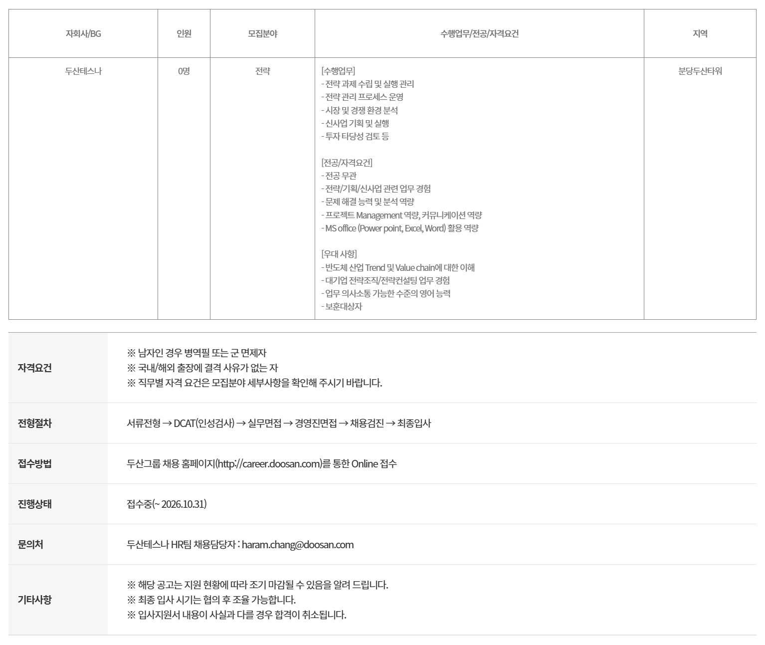 Àü·«±âȹ °æ·Â ä¿ë ÀÚȸ»ç/BG µÎ»êÅ×½º³ª Àοø 0¸í ¸ðÁýºÐ¾ß Àü·« ¼öÇà¾÷¹«/Àü°ø/ÀÚ°Ý¿ä°Ç [¼öÇà¾÷¹«] - Àü·« °úÁ¦ ¼ö¸³ ¹× ½ÇÇà °ü¸® - Àü·« °ü¸® ÇÁ·Î¼¼½º ¿î¿µ - ½ÃÀå ¹× °æÀï ȯ°æ ºÐ¼® - ½Å»ç¾÷ ±âȹ ¹× ½ÇÇà - ÅõÀÚ Å¸´ç¼º °ËÅä µî [Àü°ø/ÀÚ°Ý¿ä°Ç] - Àü°ø ¹«°ü - Àü·«/±âȹ/½Å»ç¾÷ °ü·Ã ¾÷¹« °æÇè - ¹®Á¦ ÇØ°á ´É·Â ¹× ºÐ¼® ¿ª·® - ÇÁ·ÎÁ§Æ® Management ¿ª·®, Ä¿¹Â´ÏÄÉÀÌ¼Ç ¿ª·® - MS office (Power point, Excel, Word) Ȱ¿ë ¿ª·® [¿ì´ë »çÇ×] - ¹ÝµµÃ¼ »ê¾÷ Trend ¹× Value chain¿¡ ´ëÇÑ ÀÌÇØ - ´ë±â¾÷ Àü·«Á¶Á÷/Àü·«ÄÁ¼³ÆÃ ¾÷¹« °æÇè - ¾÷¹« ÀÇ»ç¼ÒÅë °¡´ÉÇÑ ¼öÁØÀÇ ¿µ¾î ´É·Â - º¸ÈÆ´ë»óÀÚ Áö¿ª ºÐ´çµÎ»êŸ¿ö ÀÚ°Ý¿ä°Ç ¡Ø ³²ÀÚÀÎ °æ¿ì º´¿ªÇÊ ¶Ç´Â ±º ¸éÁ¦ÀÚ ¡Ø ±¹³»/ÇØ¿Ü ÃâÀå¿¡ °á°Ý »çÀ¯°¡ ¾ø´Â ÀÚ ¡Ø Á÷¹«º° ÀÚ°Ý ¿ä°ÇÀº ¸ðÁýºÐ¾ß ¼¼ºÎ»çÇ×À» È®ÀÎÇØ Áֽñ⠹ٶø´Ï´Ù. ÀüÇüÀýÂ÷ ¼­·ùÀüÇü ¡æ DCAT(Àμº°Ë»ç) ¡æ ½Ç¹«¸éÁ¢ ¡æ °æ¿µÁø¸éÁ¢ ¡æ ä¿ë°ËÁø ¡æ ÃÖÁ¾ÀÔ»ç Á¢¼ö¹æ¹ý µÎ»ê±×·ì ä¿ë ȨÆäÀÌÁö(http://career.doosan.com)¸¦ ÅëÇÑ Online Á¢¼ö ÁøÇà»óÅ Á¢¼öÁß(~ 2026.10.31) ¹®ÀÇó µÎ»êÅ×½º³ª HRÆÀ ä¿ë´ã´çÀÚ : ******@*******.*** ±âŸ»çÇ× ¡Ø ÇØ´ç °ø°í´Â Áö¿ø ÇöȲ¿¡ µû¶ó Á¶±â ¸¶°¨µÉ ¼ö ÀÖÀ½À» ¾Ë·Á µå¸³´Ï´Ù. ¡Ø ÃÖÁ¾ ÀÔ»ç ½Ã±â´Â ÇùÀÇ ÈÄ Á¶À² °¡´ÉÇÕ´Ï´Ù. ¡Ø ÀÔ»çÁö¿ø¼­ ³»¿ëÀÌ »ç½Ç°ú ´Ù¸¦ °æ¿ì ÇÕ°ÝÀÌ Ãë¼ÒµË´Ï´Ù.