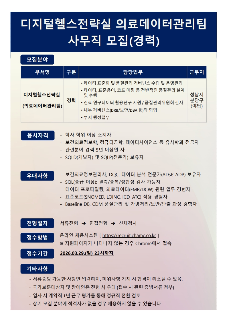 [¼º±¤ÀÇ·áÀç´Ü Â÷º´¿ø] [Â÷º´¿ø] ÀÇ·áµ¥ÀÌÅͰü¸®ÆÀ »ç¹«Á÷(°æ·Â) ¸ðÁý