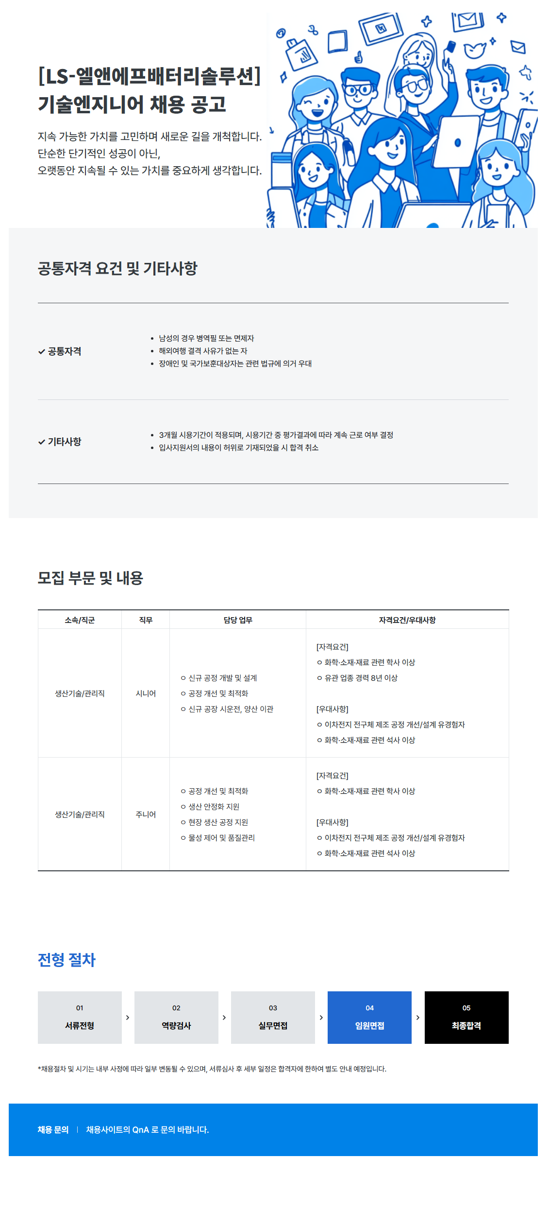 °øÅëÀÚ°Ý ¿ä°Ç ¹× ±âŸ»çÇ× ✓ °øÅëÀÚ°Ý ³²¼ºÀÇ °æ¿ì º´¿ªÇÊ ¶Ç´Â ¸éÁ¦ÀÚ ÇØ¿Ü¿©Çà °á°Ý »çÀ¯°¡ ¾ø´Â ÀÚ Àå¾ÖÀÎ ¹× ±¹°¡º¸ÈÆ´ë»óÀÚ´Â °ü·Ã ¹ý±Ô¿¡ ÀǰŠ¿ì´ë ✓ ±âŸ»çÇ× 3°³¿ù ½Ã¿ë±â°£ÀÌ Àû¿ëµÇ¸ç, ½Ã¿ë±â°£ Áß Æò°¡°á°ú¿¡ µû¶ó °è¼Ó ±Ù·Î ¿©ºÎ °áÁ¤ ÀÔ»çÁö¿ø¼­ÀÇ ³»¿ëÀÌ ÇãÀ§·Î ±âÀçµÇ¾úÀ» ½Ã ÇÕ°Ý Ãë¼Ò ¸ðÁý ºÎ¹® ¹× ³»¿ë ¼Ò¼Ó/Á÷±º Á÷¹« ´ã´ç ¾÷¹« ÀÚ°Ý¿ä°Ç/¿ì´ë»çÇ× »ý»ê±â¼ú/°ü¸®Á÷ ½Ã´Ï¾î ¤· ½Å±Ô °øÁ¤ °³¹ß ¹× ¼³°è ¤· °øÁ¤ °³¼± ¹× ÃÖÀûÈ­ ¤· ½Å±Ô °øÀå ½Ã¿îÀü, ¾ç»ê À̰ü [ÀÚ°Ý¿ä°Ç] ¤· È­ÇС¤¼ÒÀ硤Àç·á °ü·Ã Çлç ÀÌ»ó ¤· À¯°ü ¾÷Á¾ °æ·Â 8³â ÀÌ»ó [¿ì´ë»çÇ×] ¤· ÀÌÂ÷ÀüÁö Àü±¸Ã¼ Á¦Á¶ °øÁ¤ °³¼±/¼³°è À¯°æÇèÀÚ ¤· È­ÇС¤¼ÒÀ硤Àç·á °ü·Ã ¼®»ç ÀÌ»ó »ý»ê±â¼ú/°ü¸®Á÷ ÁÖ´Ï¾î ¤· °øÁ¤ °³¼± ¹× ÃÖÀûÈ­ ¤· »ý»ê ¾ÈÁ¤È­ Áö¿ø ¤· ÇöÀå »ý»ê °øÁ¤ Áö¿ø ¤· ¹°¼º Á¦¾î ¹× ǰÁú°ü¸® [ÀÚ°Ý¿ä°Ç] ¤· È­ÇС¤¼ÒÀ硤Àç·á °ü·Ã Çлç ÀÌ»ó [¿ì´ë»çÇ×] ¤· ÀÌÂ÷ÀüÁö Àü±¸Ã¼ Á¦Á¶ °øÁ¤ °³¼±/¼³°è À¯°æÇèÀÚ ¤· È­ÇС¤¼ÒÀ硤Àç·á °ü·Ã ¼®»ç ÀÌ»ó