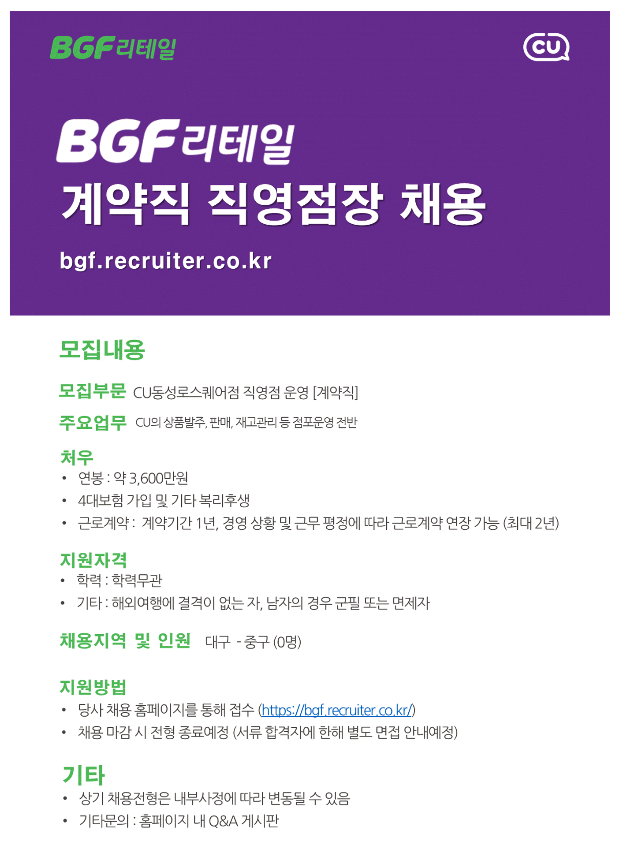 [BGF¸®Å×ÀÏ] 2026³â °è¾àÁ÷ Á÷¿µÁ¡Àå ä¿ë - µ¿¼º·Î½ºÄù¾îÁ¡